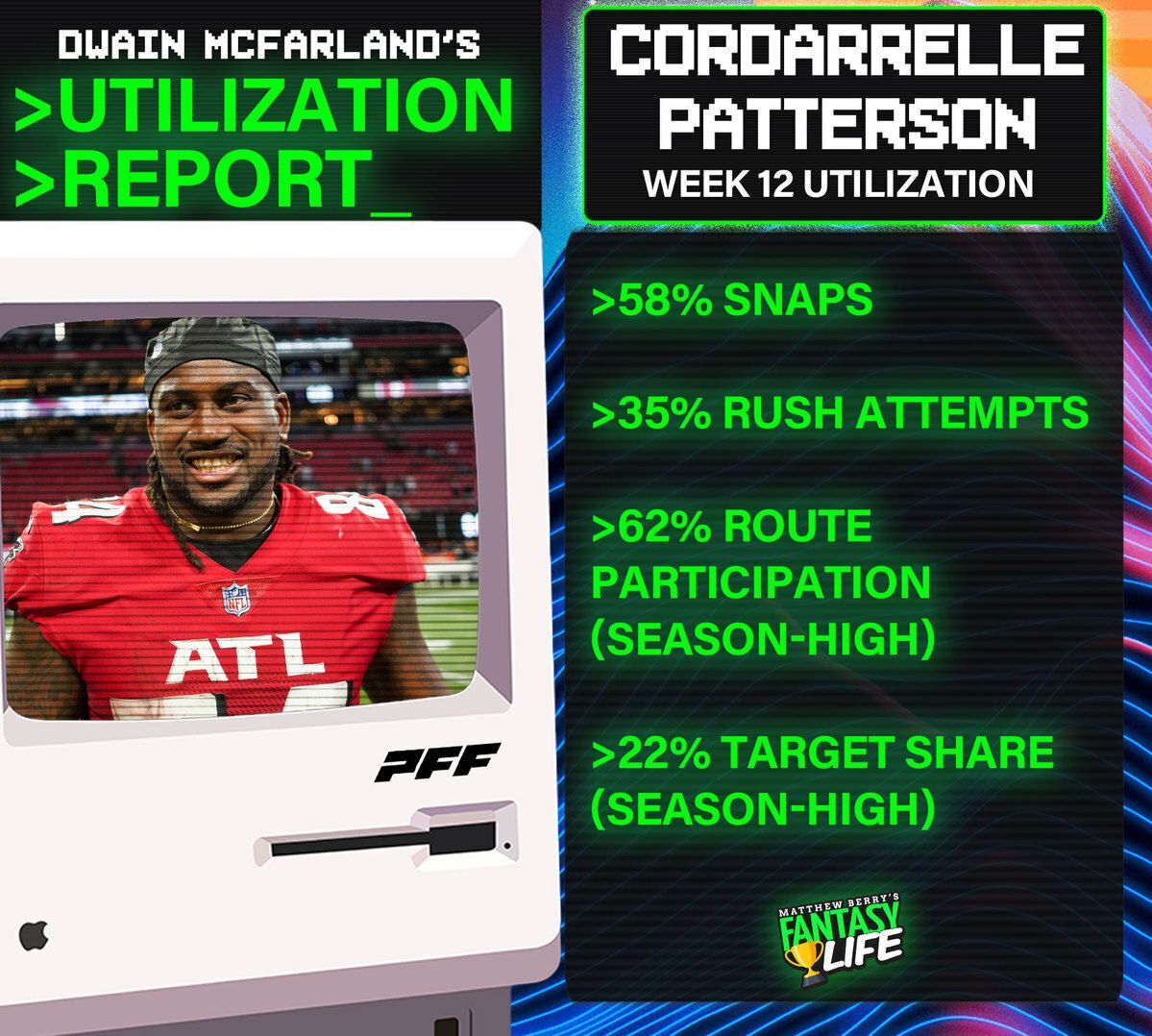 In addition to C-Patt's increased role, AtlantaĀ reduced Caleb Huntley's snapsĀ to 4% and 5% in the last two games.