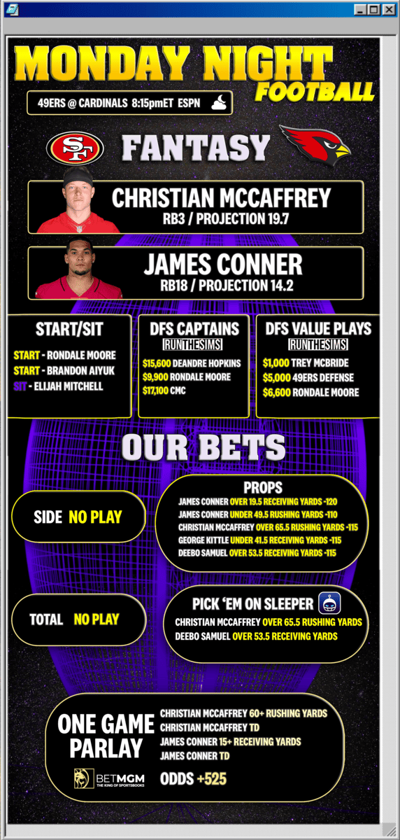Tonight, the Niners and Cardinals square off in Mexico City, though plenty is up in the air with Kyler Murray (hamstring)Ā a true game-time decision.