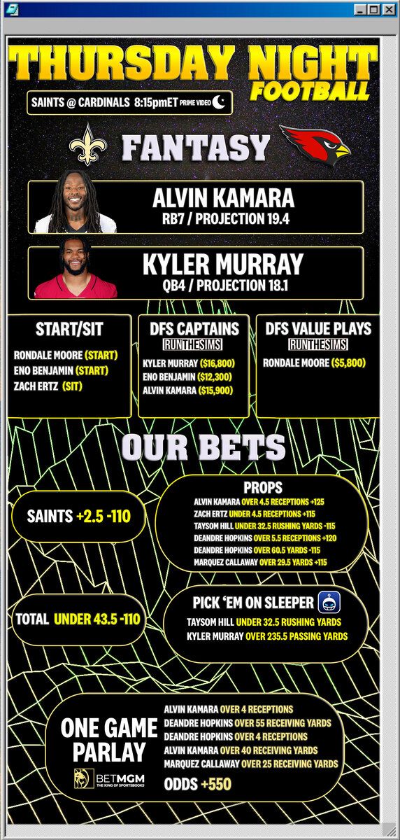 Nothing says Thursday Night Football quite like the sliding Cardinals hosting the banged-up Saints as 1.5 point home favorites on a short week.
