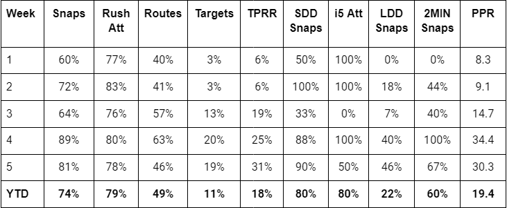 He didnāt come through in Week 6, but the utilization was there with an 87% snap share, 58% rush share and 83% route participation.Ā