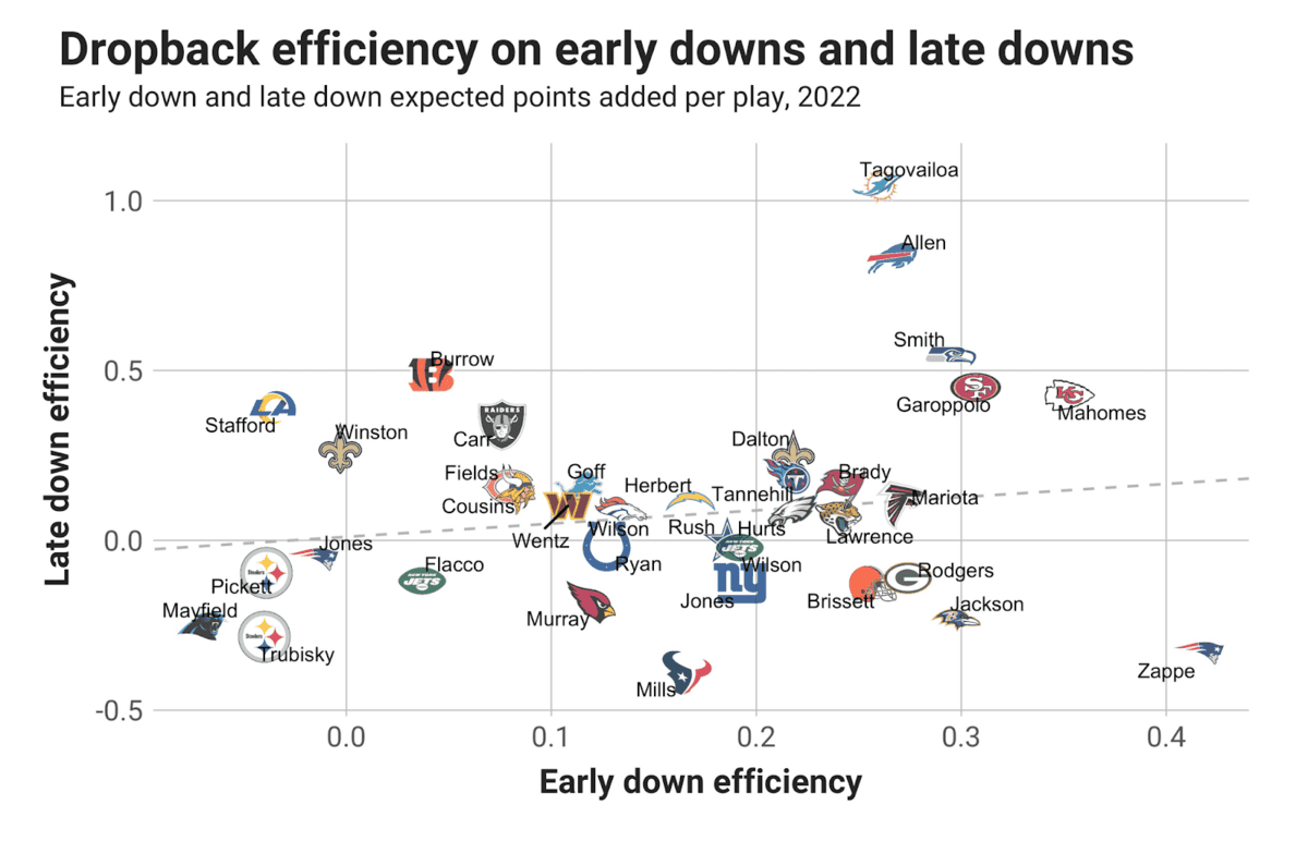 Kevin is rightĀ to wonder if the dreaded āRā(regression) word will come for Allen. His 0.8 EPA per dropback on third and fourth down not only leads the league but is a career-high for Allen. Even wilder is his play volume in this particular scenario.