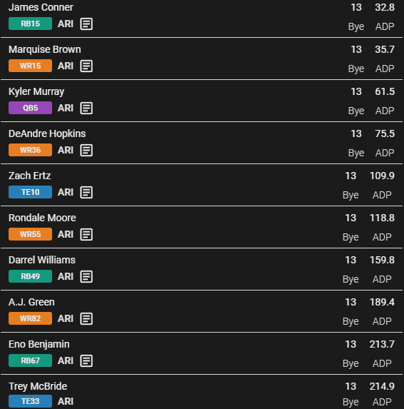 The best part about the Cardinals is that there are players at every ADP to stack with Kyler Murray, an elite QB who you can sometimes get as a value deeper into Round 5 and sometimes into Round 6. There are top-level WRs that you can get at reasonable prices like Marquise Brown (Round 3/4) and DeAndre Hopkins (mid-Round 7).