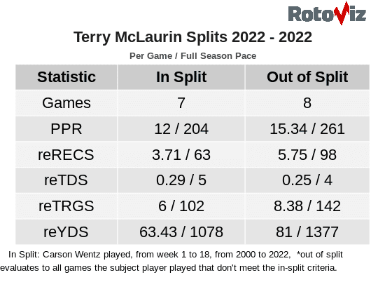 While McLaurin is undoubtedly a fine receiver in his own right, he takes a pretty sizable hit in production with Wentz back in the saddle vs. Heinicke: