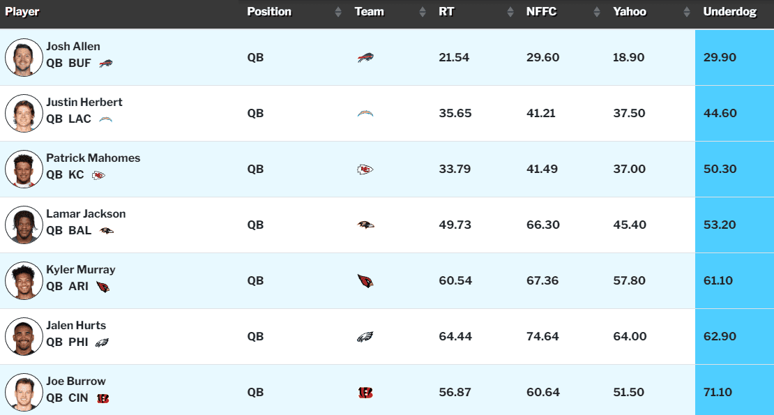 - QB Patrick Mahomes (Underdog ADP 50.2, QB3)