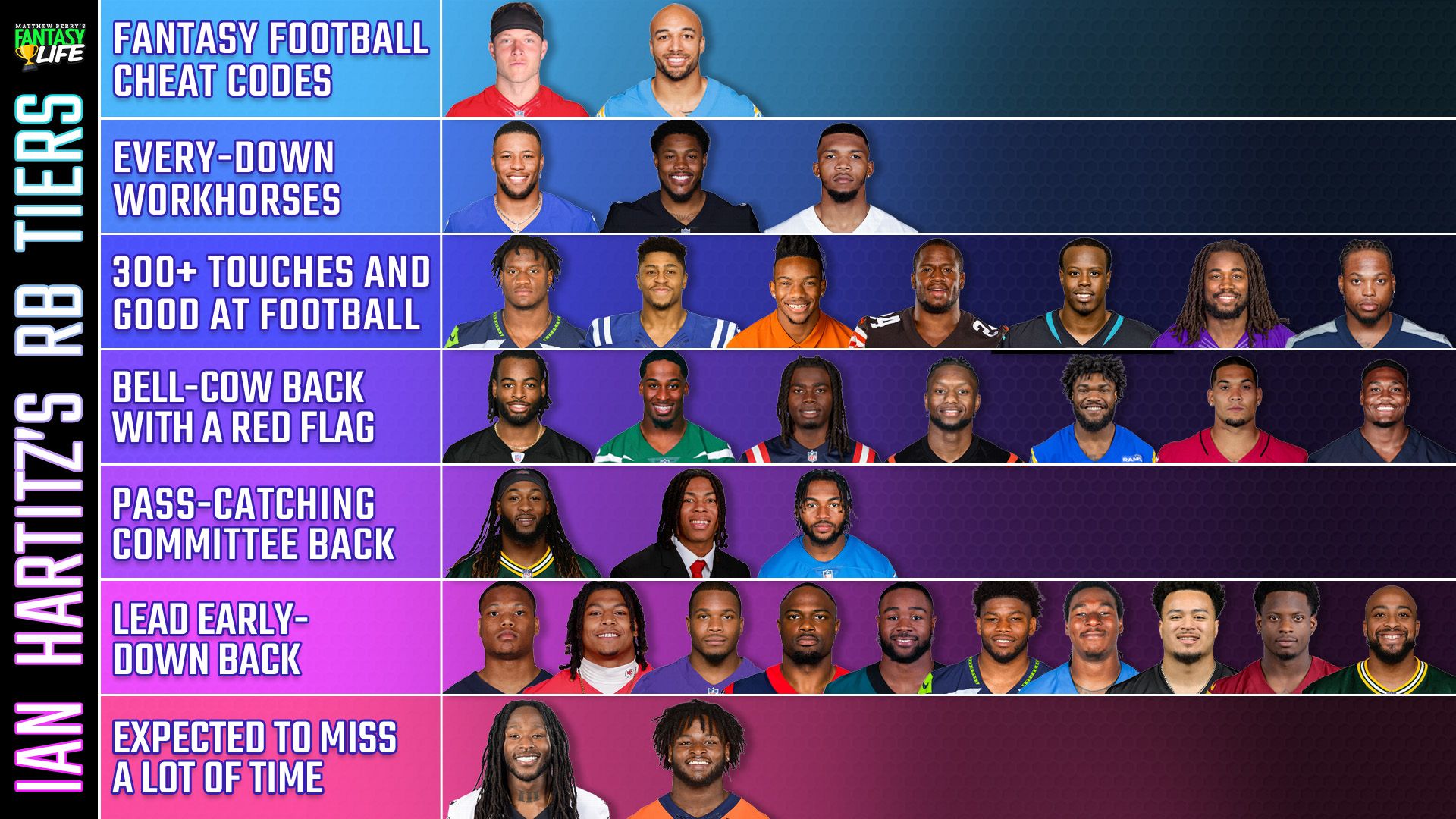 Ian Hartitz ranks the top 100 RBs for the 2023 fantasy football season, separating them out into tiers based on ADP and range of outcomes for each RB.