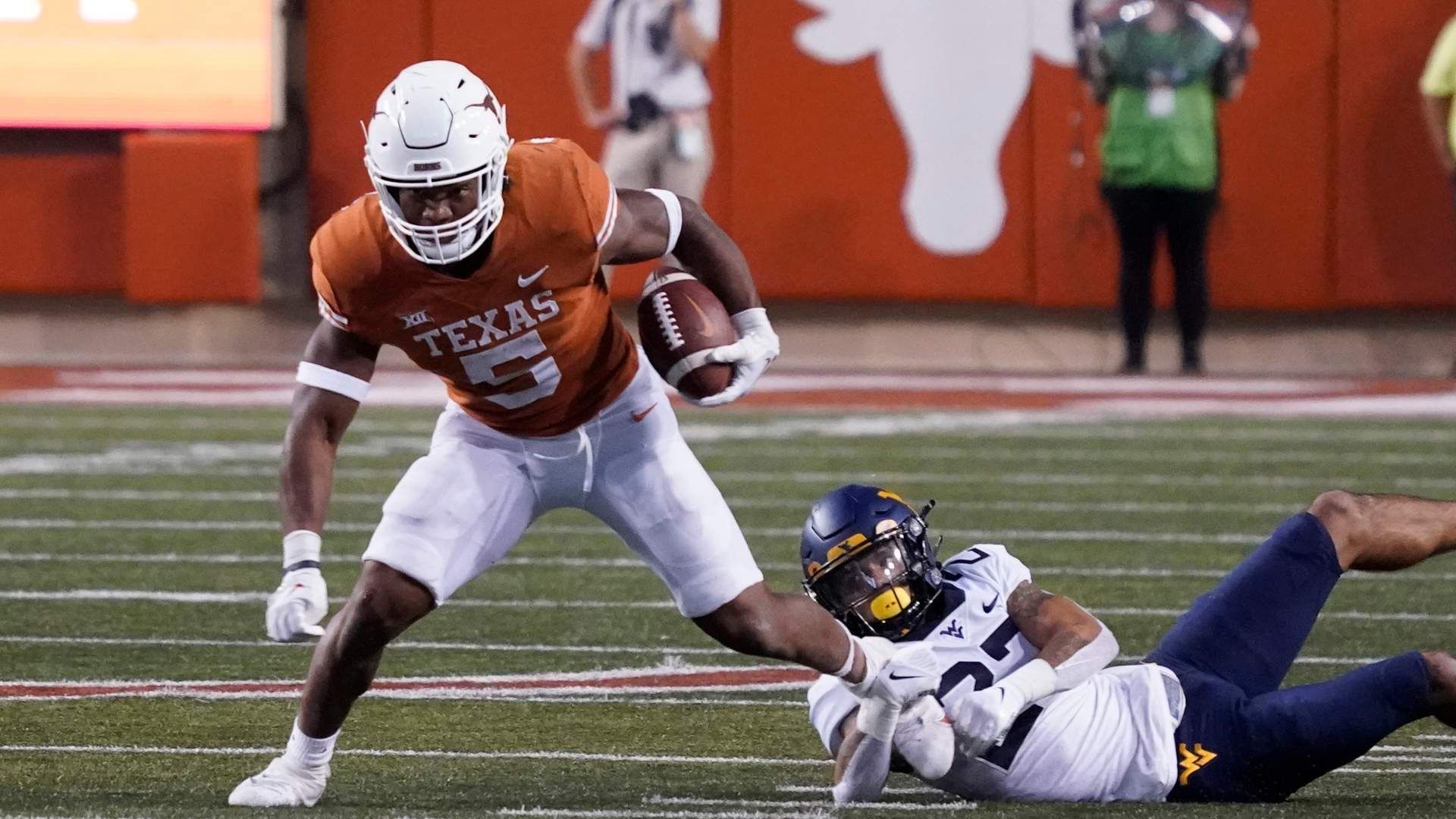 Oct 1, 2022; Austin, Texas, USA; Texas Longhorns running back Bijan Robinson (5) eludes West Virginia Mountaineers defensive back Davis Mallinger (27) during the first half at Darrell K Royal-Texas Memorial Stadium. Mandatory Credit: Scott Wachter-USA TODAY Sports