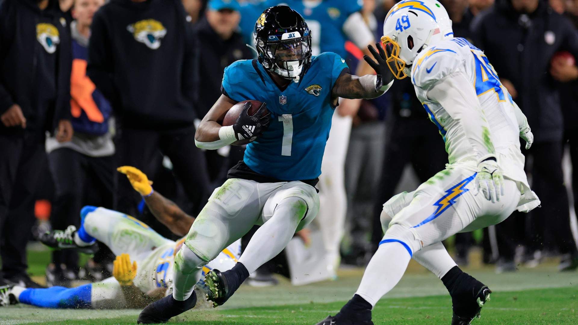 Jacksonville Jaguars running back Travis Etienne Jr. (1) rushes for yards against Los Angeles Chargers linebacker Drue Tranquill (49) during the fourth quarter of an NFL first round playoff football matchup Saturday, Jan. 14, 2023 at TIAA Bank Field in Jacksonville, Fla. The Jacksonville Jaguars edged the Los Angeles Chargers on a field goal 31-30. [Corey Perrine/Florida Times-Union] Jki 011423 Chargers Jags Cp 88 Credit: Corey Perrine/Florida Times-Union / USA TODAY NETWORK