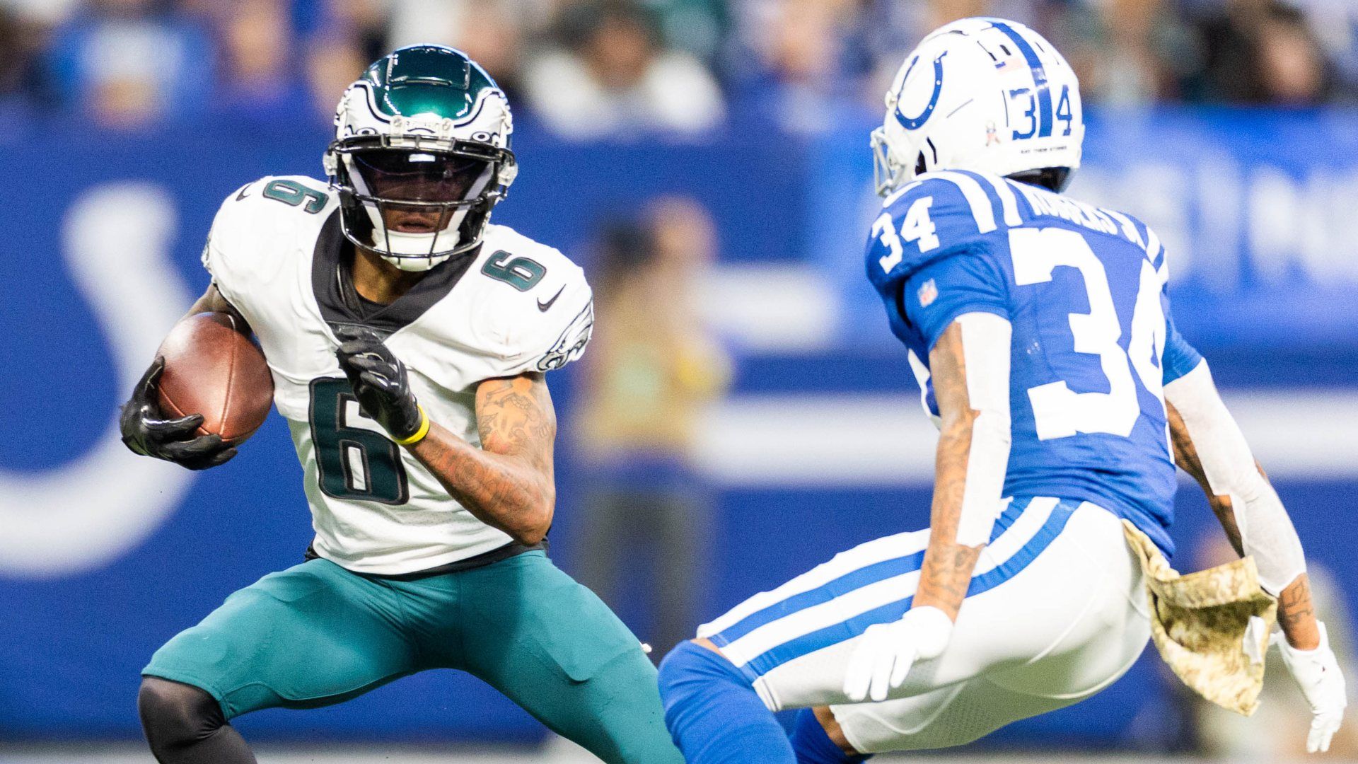 Nov 20, 2022; Indianapolis, Indiana, USA; Philadelphia Eagles wide receiver DeVonta Smith (6) runs with the ball while Indianapolis Colts cornerback Isaiah Rodgers (34) defends in the first quarter at Lucas Oil Stadium. Mandatory Credit: Trevor Ruszkowski-USA TODAY Sports