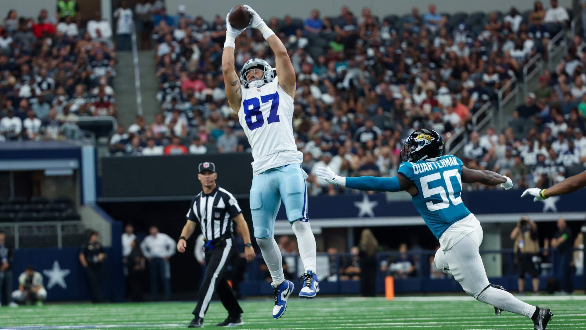 Aug 12, 2023; Arlington, Texas, USA; Dallas Cowboys tight end Jake Ferguson (87) makes a leaping catch past Jacksonville Jaguars linebacker Shaquille Quarterman (50) during the first quarter at AT&T Stadium. Mandatory Credit: Kevin Jairaj-USA TODAY Sports