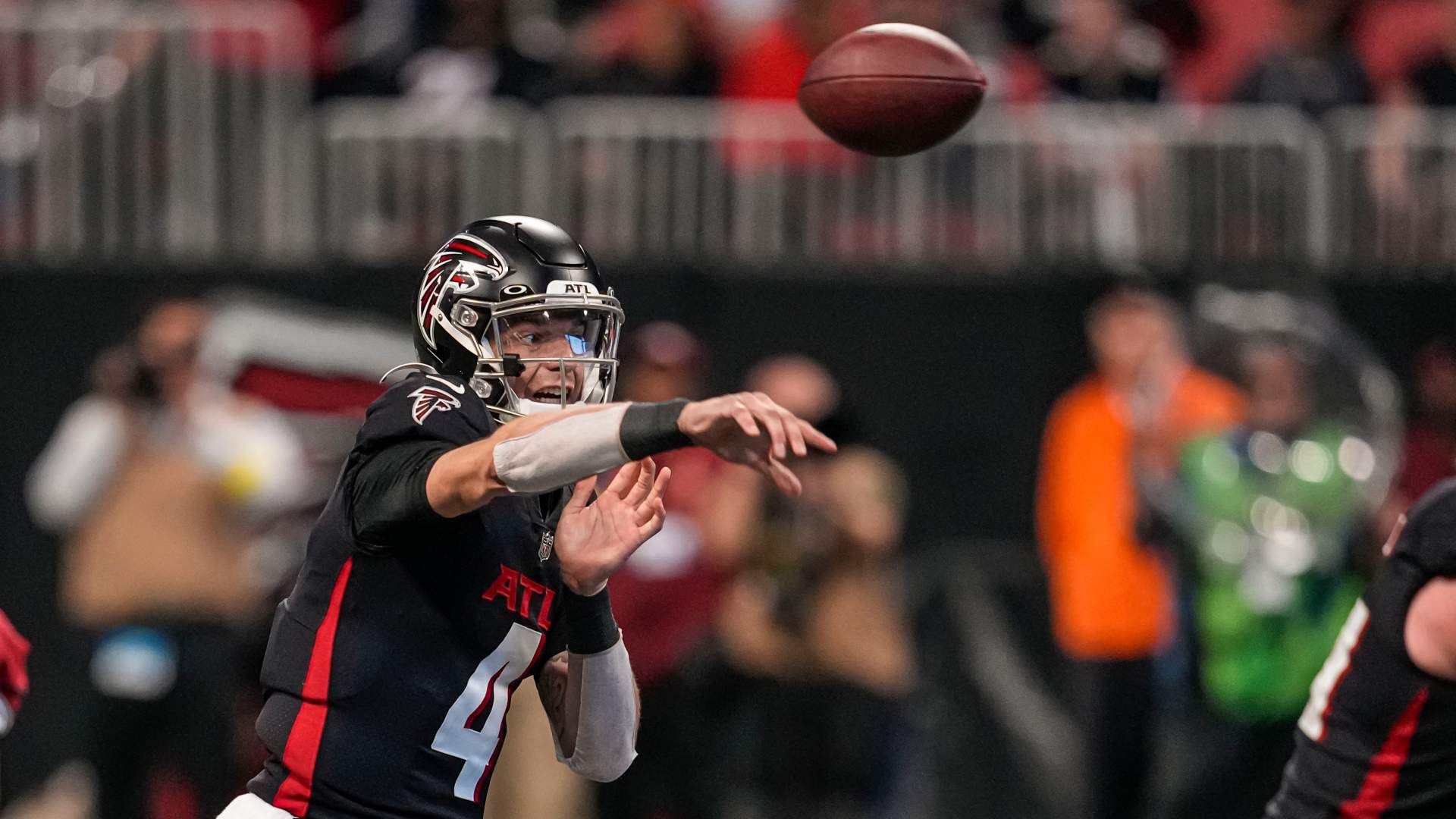 Jan 1, 2023; Atlanta, Georgia, USA; Atlanta Falcons quarterback Desmond Ridder (4) passes against the Arizona Cardinals during the second half at Mercedes-Benz Stadium. Mandatory Credit: Dale Zanine-USA TODAY Sports