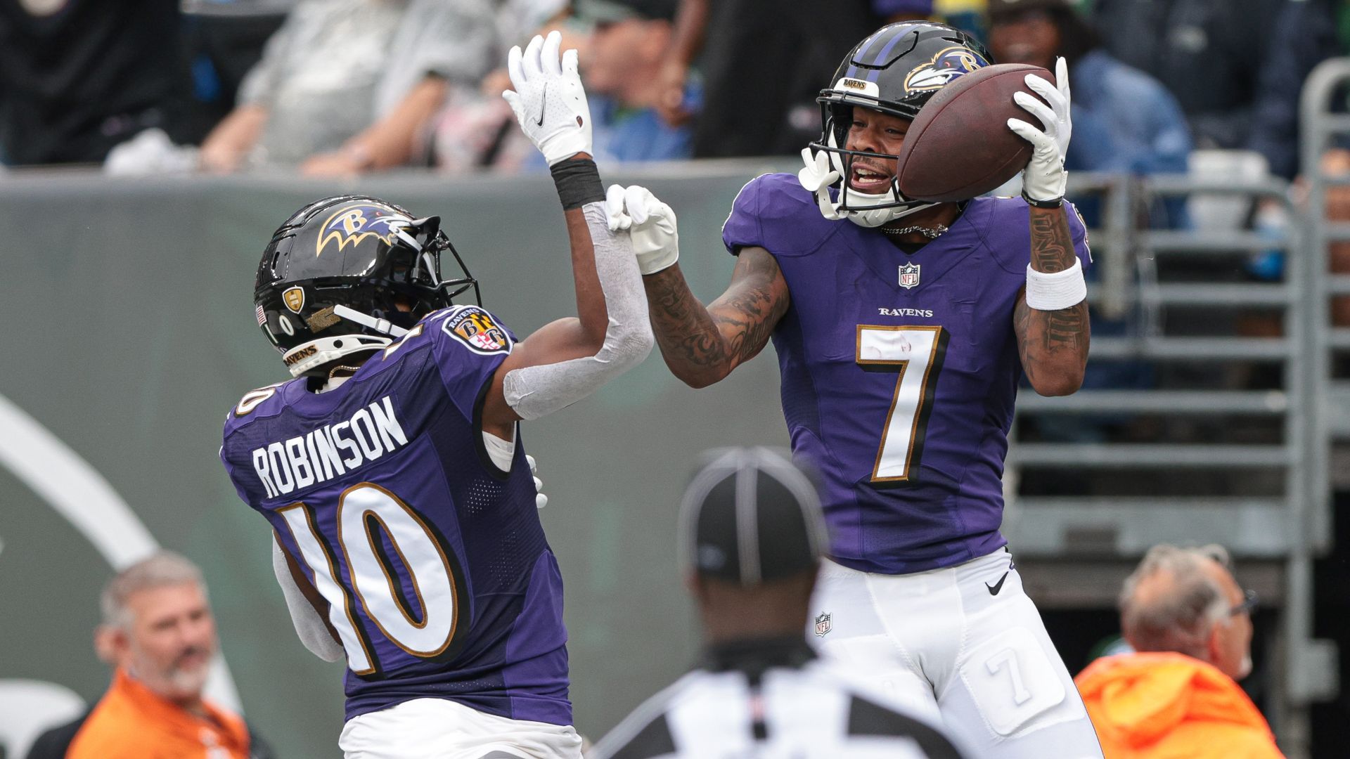 Sep 11, 2022; East Rutherford, New Jersey, USA; Baltimore Ravens wide receiver Rashod Bateman (7) celebrates with wide receiver Demarcus Robinson (10) after scoring a touchdown reception during the second half against the New York Jets at MetLife Stadium. Mandatory Credit: Vincent Carchietta-USA TODAY Sports