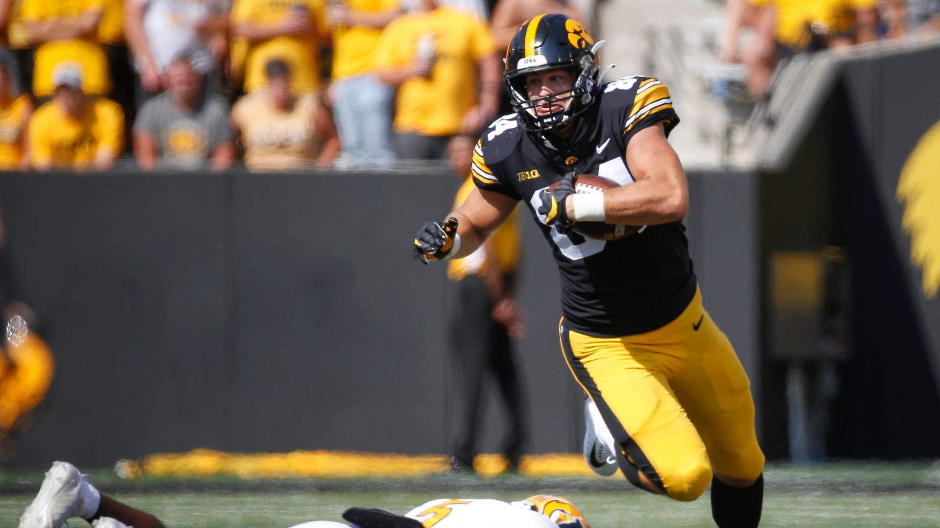 Iowa junior tight end Sam LaPorta escapes a tackle attempt by Kent State cornerback KJ Sherald in the first quarter at Kinnick Stadium in Iowa City on Saturday, Sept. 18, 2021. 20210918 Iowavskentstate Photo Credit: Bryon Houlgrave/The Register via Imagn Content Services, LLC