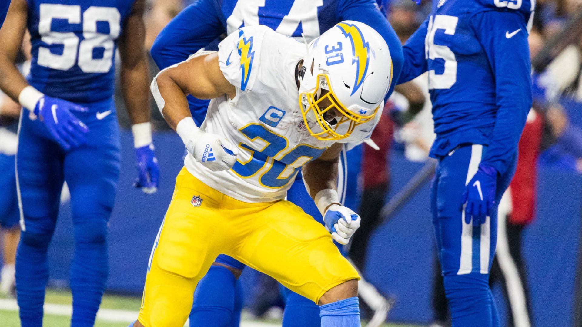 Dec 26, 2022; Indianapolis, Indiana, USA; Los Angeles Chargers running back Austin Ekeler (30) celebrates his second touchdown of the game in the second half against the Indianapolis Colts at Lucas Oil Stadium. Mandatory Credit: Trevor Ruszkowski-USA TODAY Sports