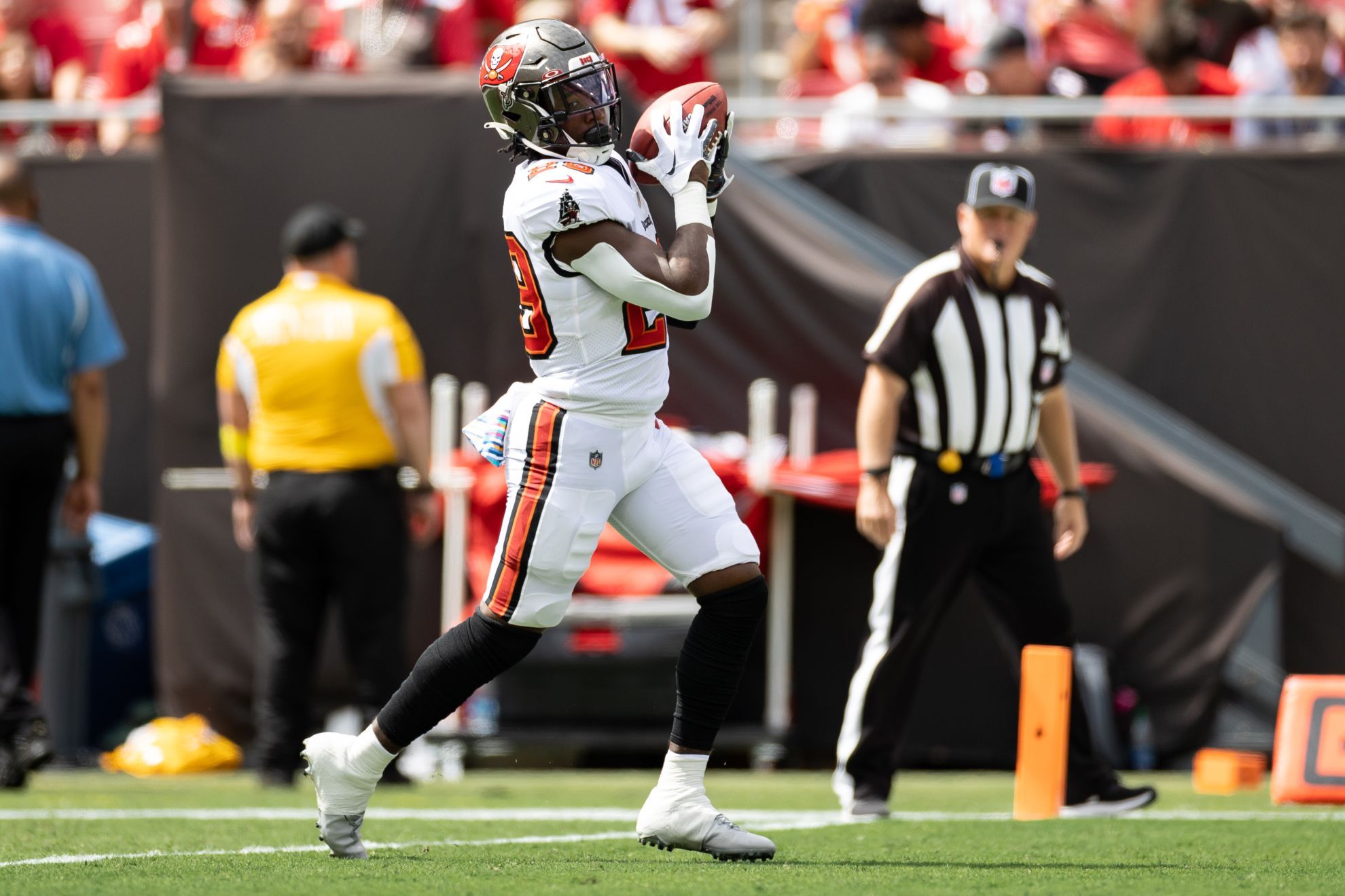 Oct 9, 2022; Tampa, Florida, USA; Tampa Bay Buccaneers running back Rachaad White (29) catches the kickoff during the first half against the Atlanta Falcons at Raymond James Stadium. Mandatory Credit: Matt Pendleton-USA TODAY Sports