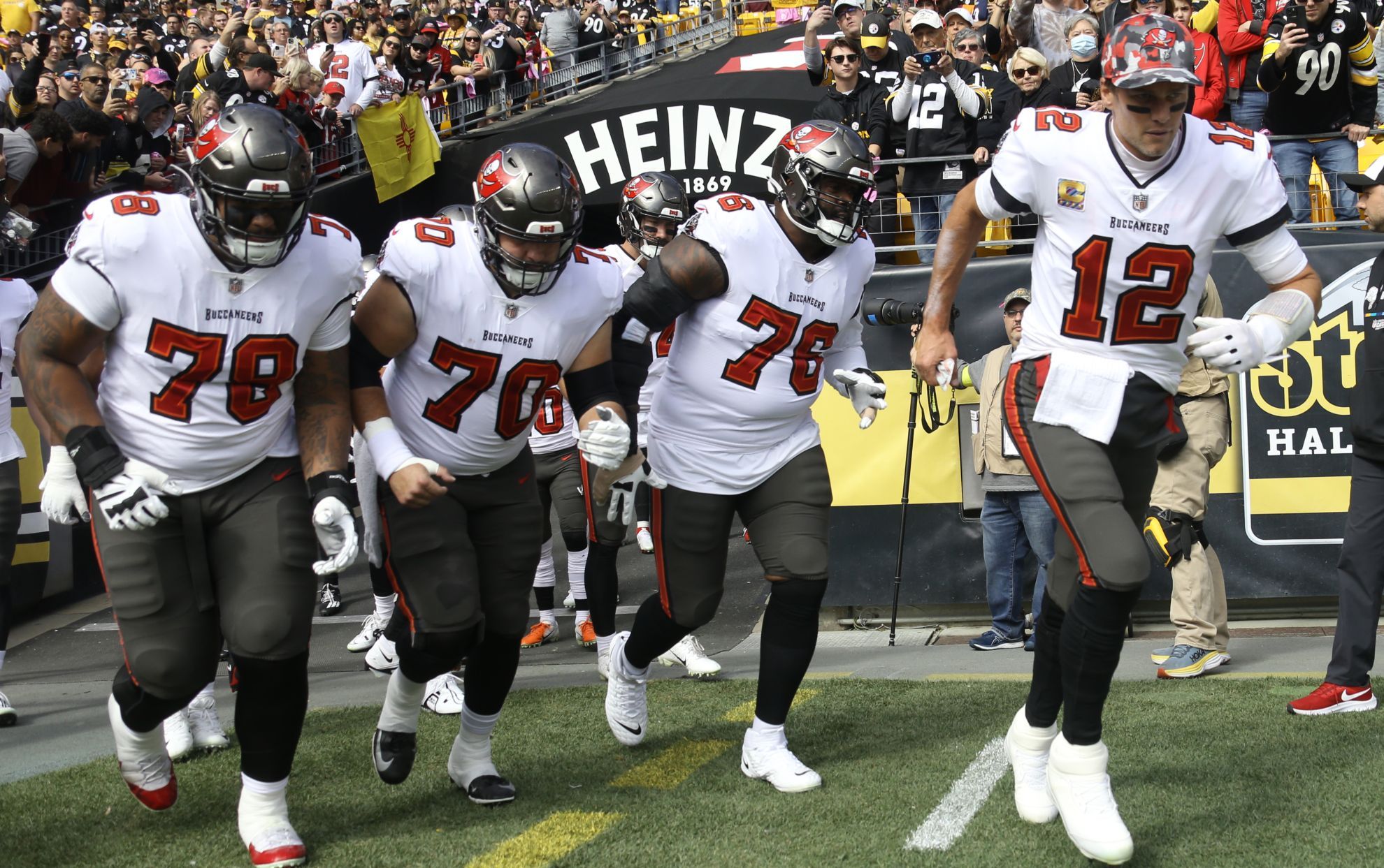 Oct 16, 2022; Pittsburgh, Pennsylvania, USA; Tampa Bay Buccaneers quarterback Tom Brady (12) and offensive tackle Tristan Wirfs (78) and offensive tackle Robert Hainsey (70) and offensive tackle Donovan Smith (76) take the field to play the Pittsburgh Steelers at Acrisure Stadium. Mandatory Credit: Charles LeClaire-USA TODAY Sports