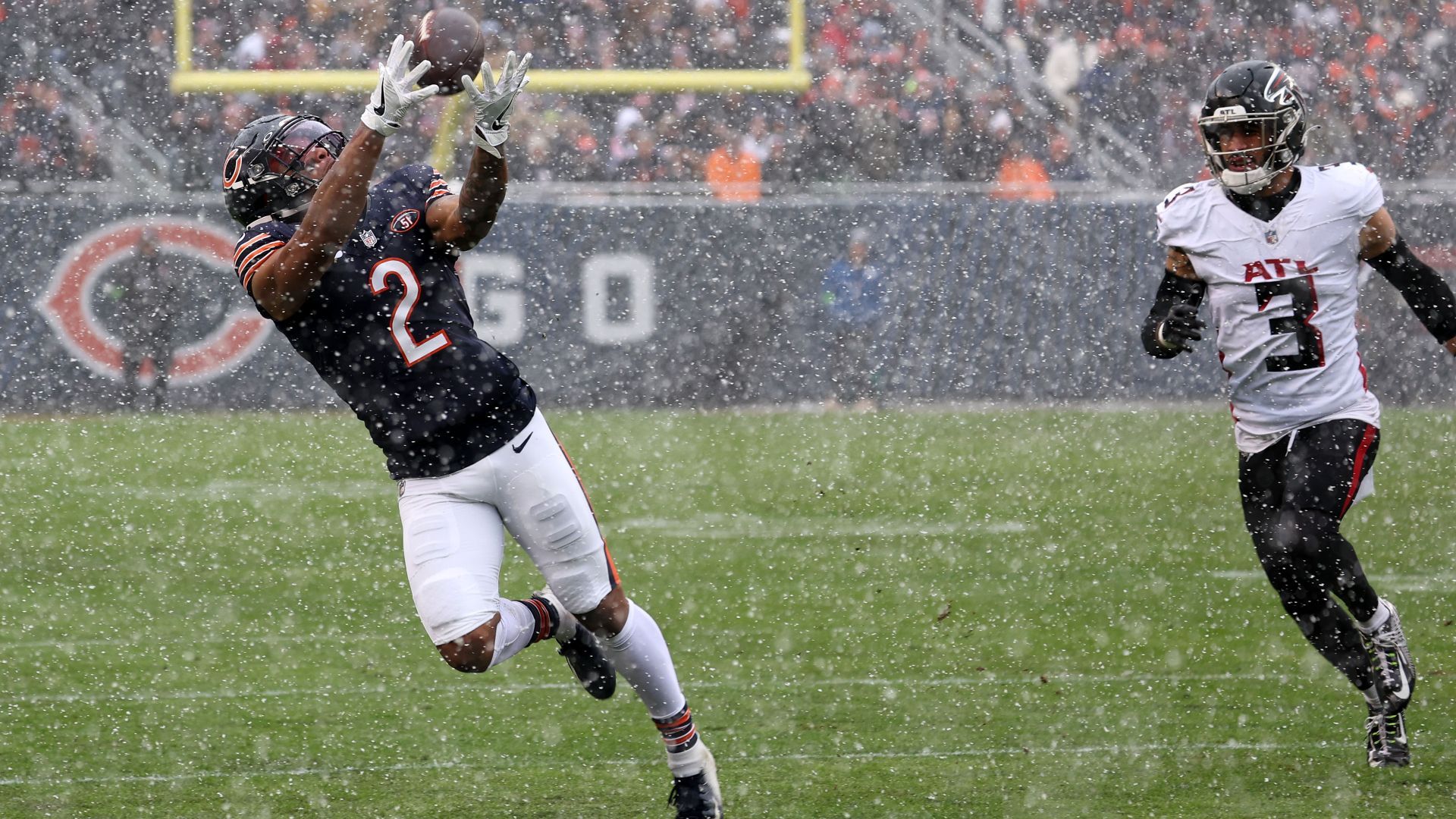 Dec 31, 2023; Chicago, Illinois, USA; Chicago Bears wide receiver DJ Moore (2) makes a catch over Atlanta Falcons safety Jessie Bates III (3) during the first half at Soldier Field. Mandatory Credit: Mike Dinovo-USA TODAY Sports