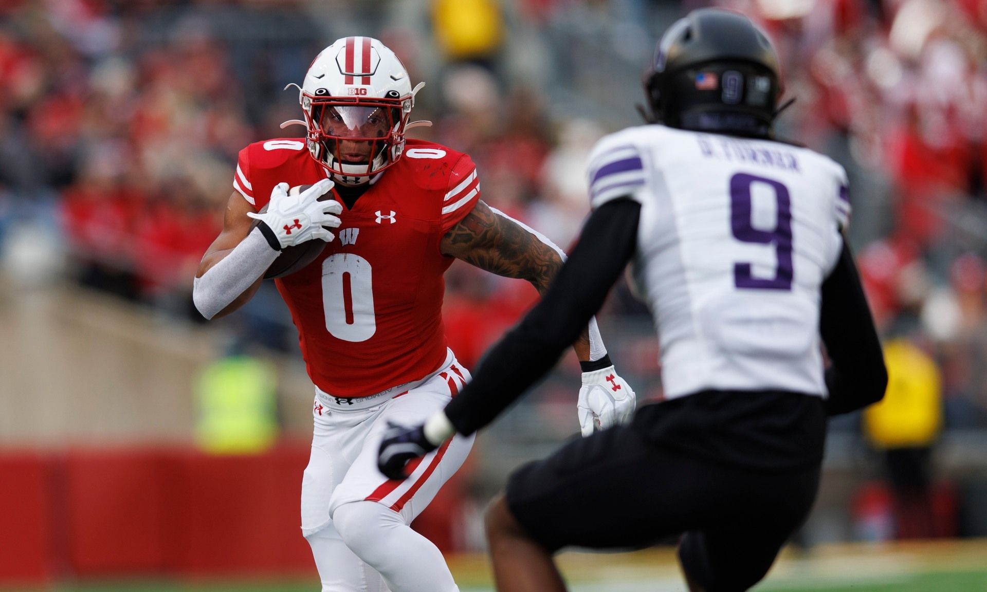 Nov 11, 2023; Madison, Wisconsin, USA; Wisconsin Badgers running back Braelon Allen (0) rushes with the football as Northwestern Wildcats defensive back Devin turner (9) defends during the first quarter at Camp Randall Stadium. Mandatory Credit: Jeff Hanisch-USA TODAY Sports