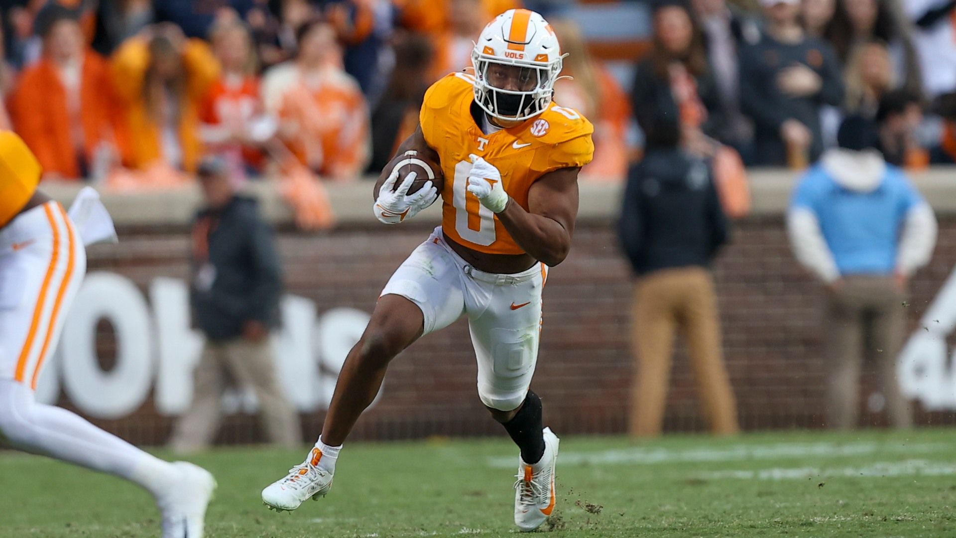 Nov 25, 2023; Knoxville, Tennessee, USA; Tennessee Volunteers running back Jaylen Wright (0) runs the ball against the Vanderbilt Commodores during the first half at Neyland Stadium. Mandatory Credit: Randy Sartin-USA TODAY Sports