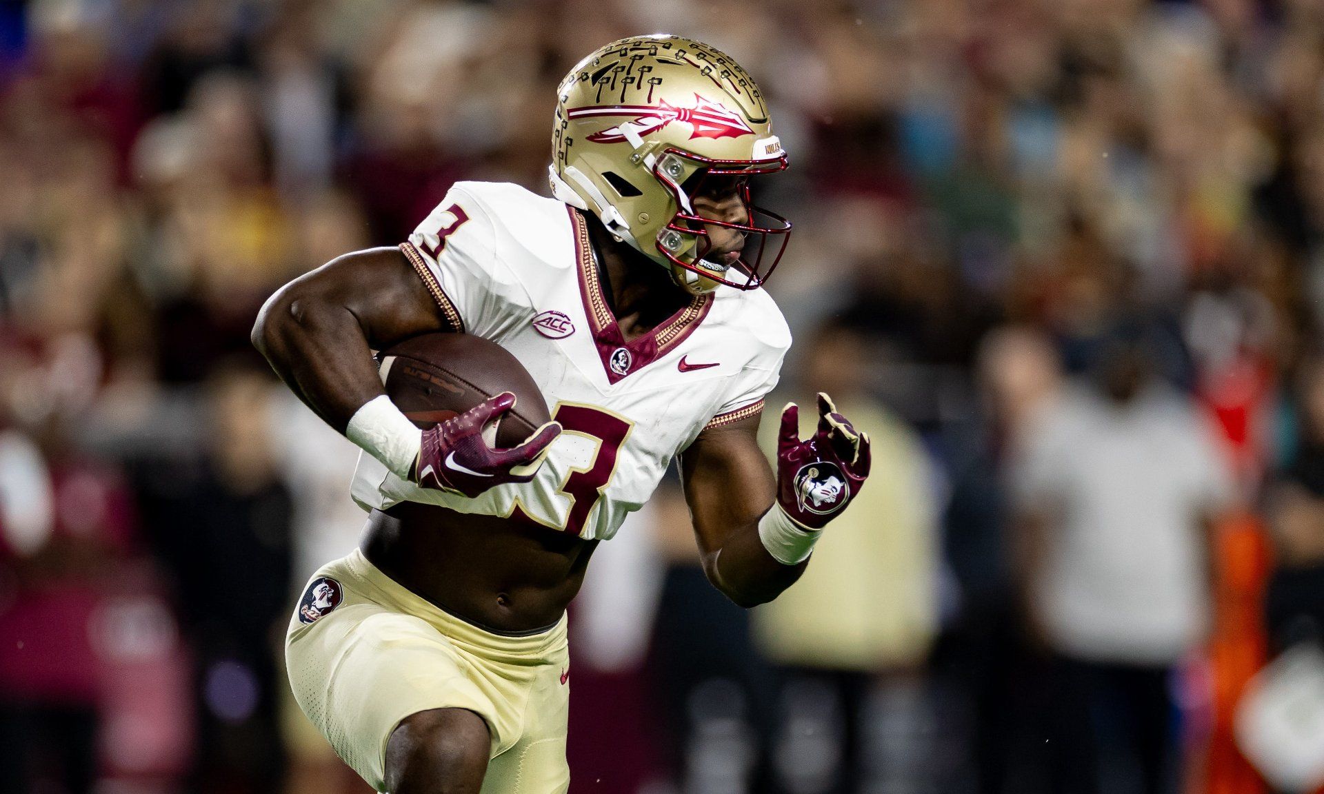 Florida State Seminoles running back Trey Benson (3) rushes with the ball during the first half against the Florida Gators at Steve Spurrier Field at Ben Hill Griffin Stadium in Gainesville, FL on Saturday, November 25, 2023. [Matt Pendleton/Gainesville Sun]