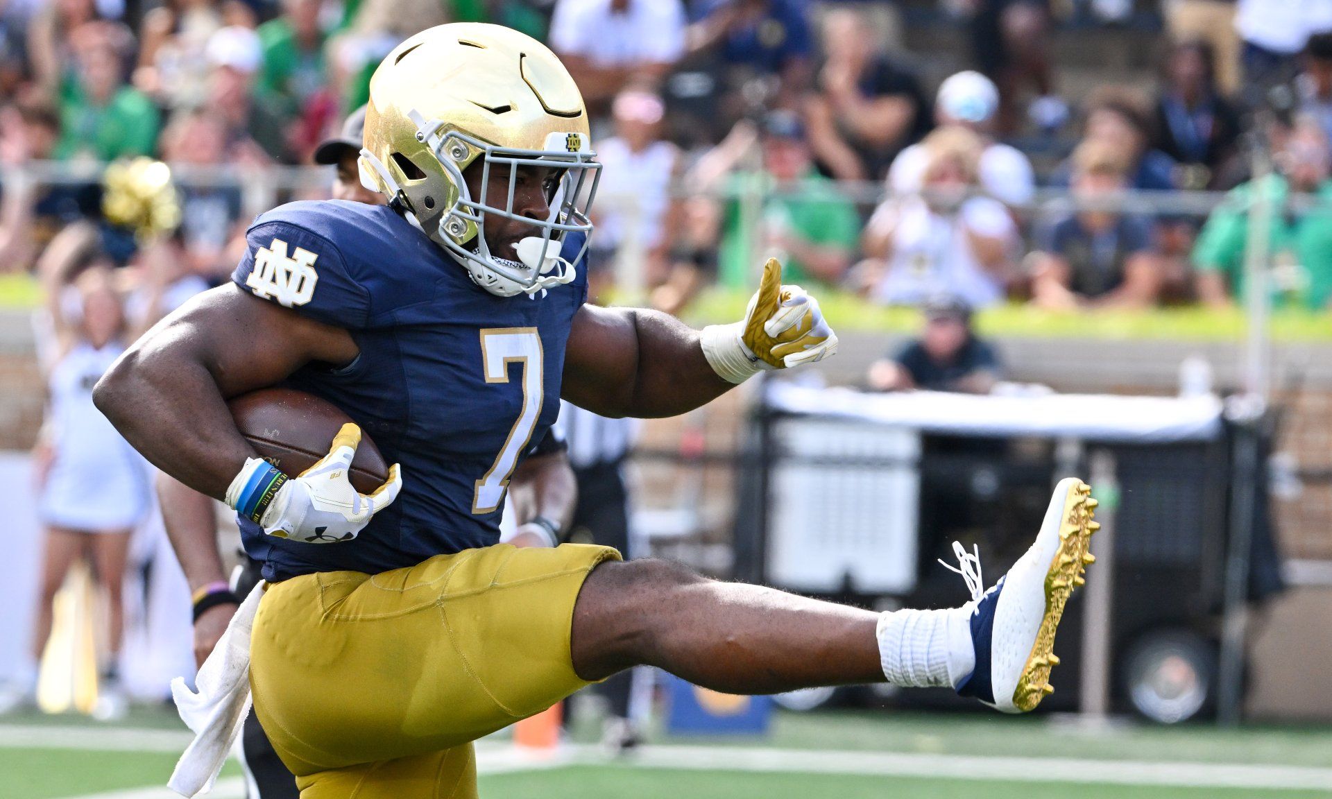 Sep 2, 2023; South Bend, Indiana, USA; Notre Dame Fighting Irish running back Audric Estime (7) scores in the second quarter against the Tennessee State Tigers at Notre Dame Stadium. Mandatory Credit: Matt Cashore-USA TODAY Sports