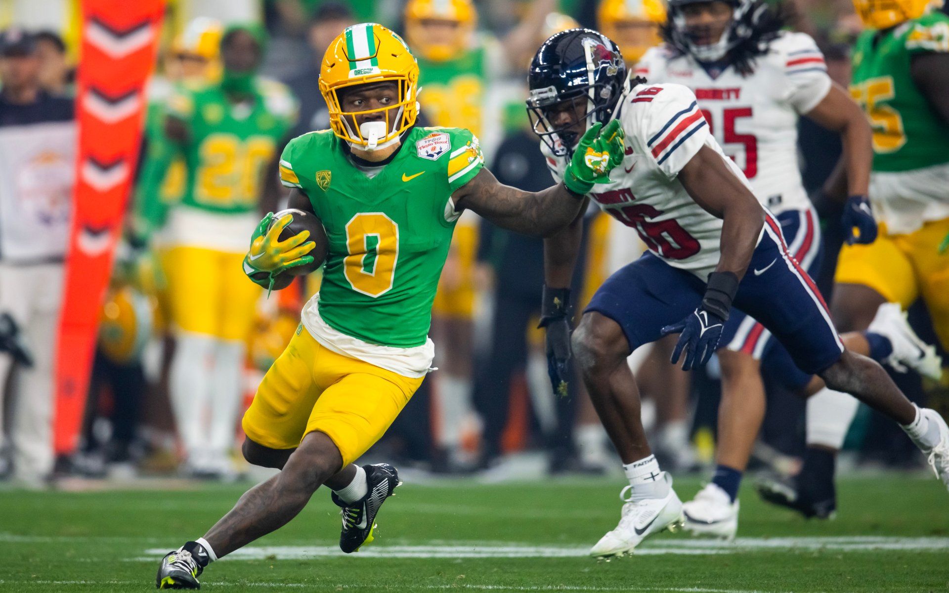 Jan 1, 2024; Glendale, AZ, USA; Oregon Ducks running back Bucky Irving (0) against the Liberty Flames during the 2024 Fiesta Bowl at State Farm Stadium. Mandatory Credit: Mark J. Rebilas-USA TODAY Sports