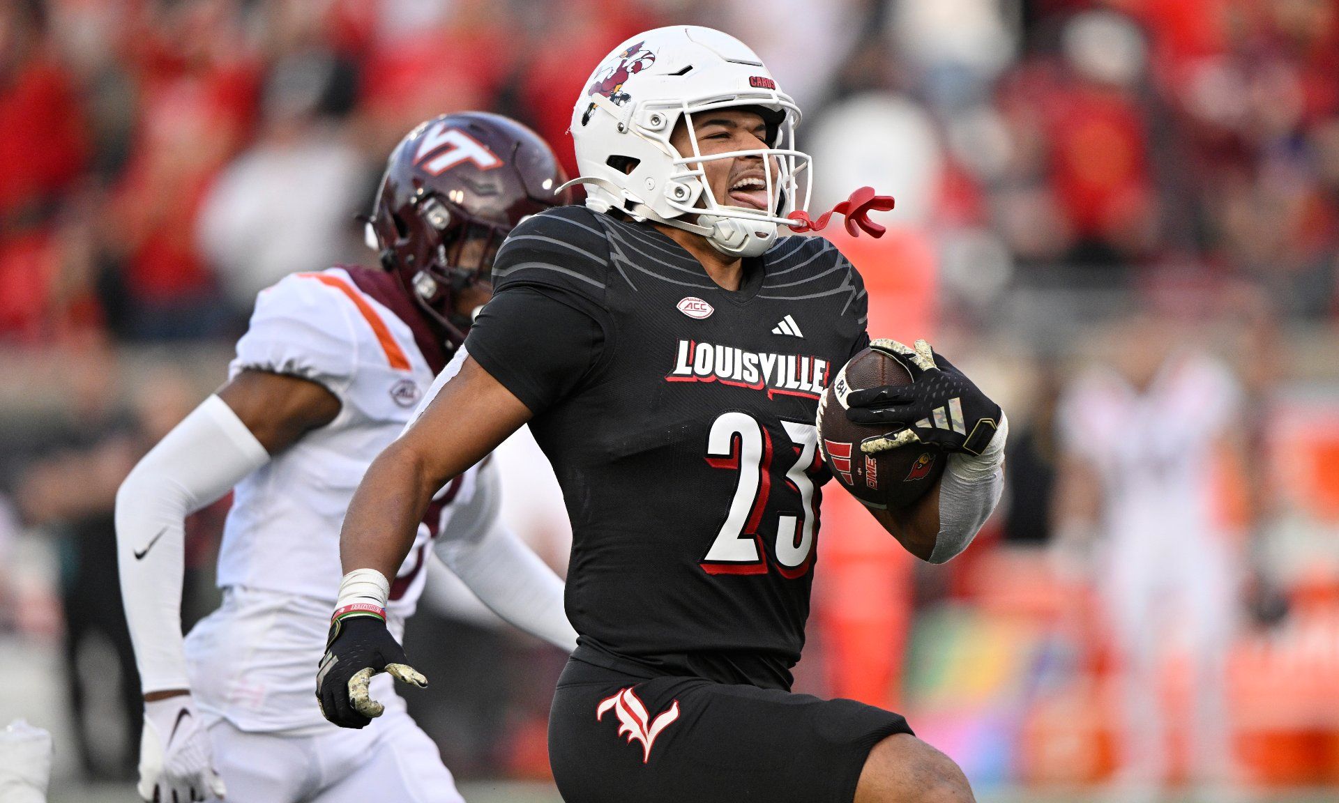 Nov 4, 2023; Louisville, Kentucky, USA; Louisville Cardinals running back Isaac Guerendo (23) runs the ball against Virginia Tech Hokies cornerback Braylon Johnson (8) to score a touchdown during the second half at L&N Federal Credit Union Stadium. Louisville defeated Virginia Tech 34-3. Mandatory Credit: Jamie Rhodes-USA TODAY Sports
