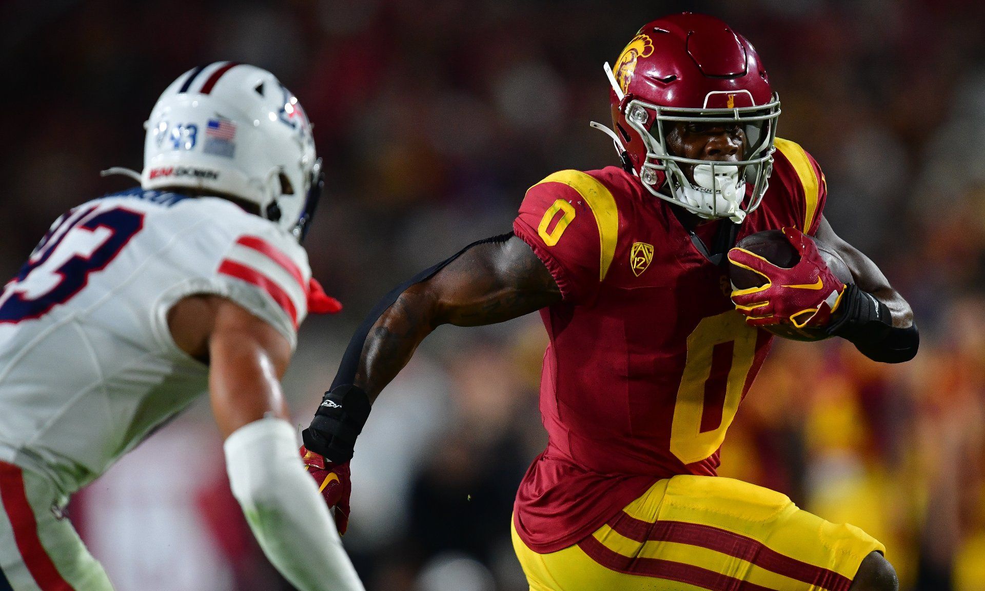Oct 7, 2023; Los Angeles, California, USA; Southern California Trojans running back MarShawn Lloyd (0) runs the ball against Arizona Wildcats safety Dalton Johnson (43) during the second half at Los Angeles Memorial Coliseum. Mandatory Credit: Gary A. Vasquez-USA TODAY Sports