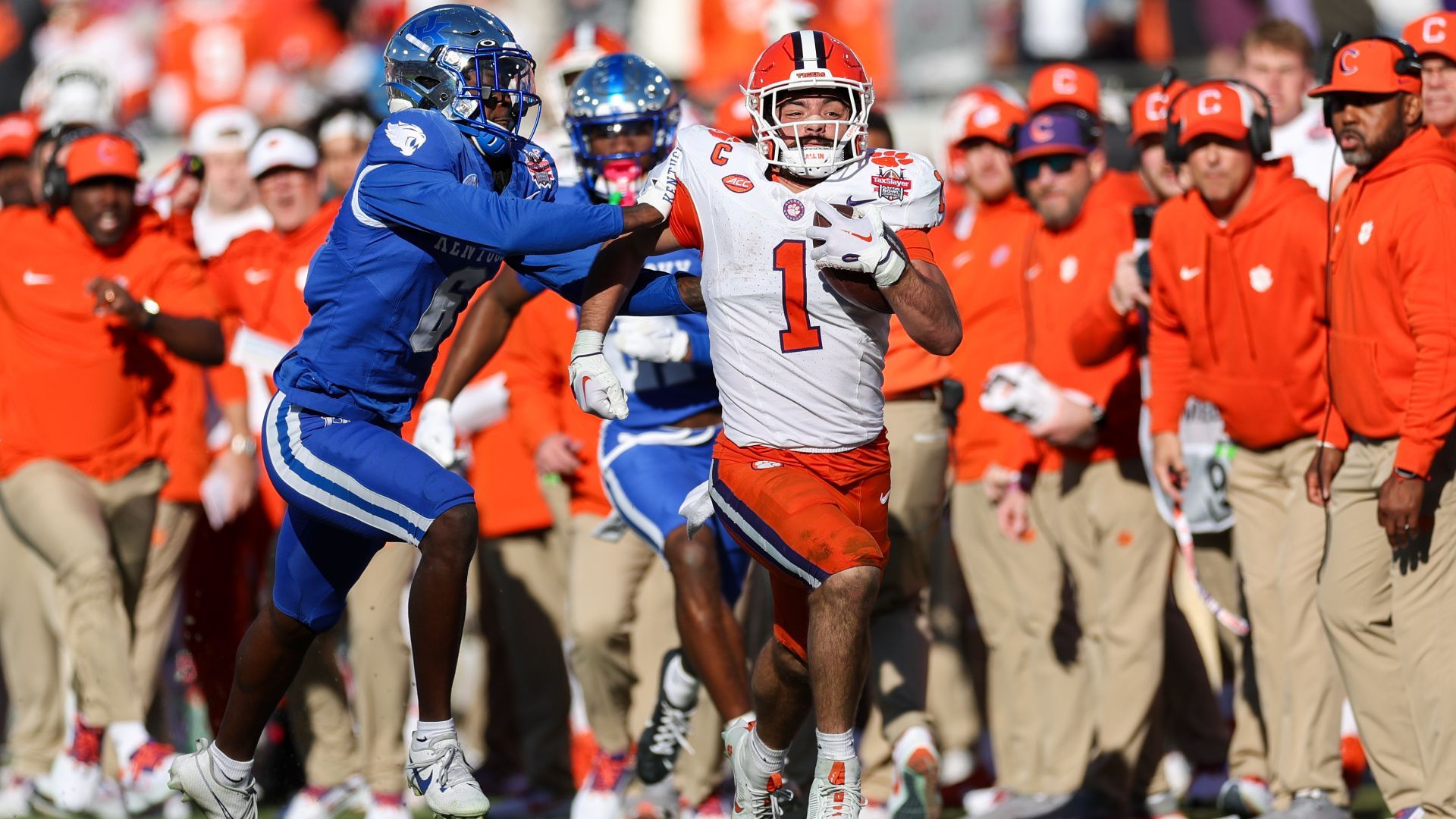 Sep 30, 2023; Syracuse, New York, USA; Clemson Tigers running back Will Shipley (1) carries the ball as Clemson Tigers linebacker Barrett Carter (0) tries to make a tackle in the fourth quarter at the JMA Wireless Dome. Mandatory Credit: Mark Konezny-USA TODAY Sports