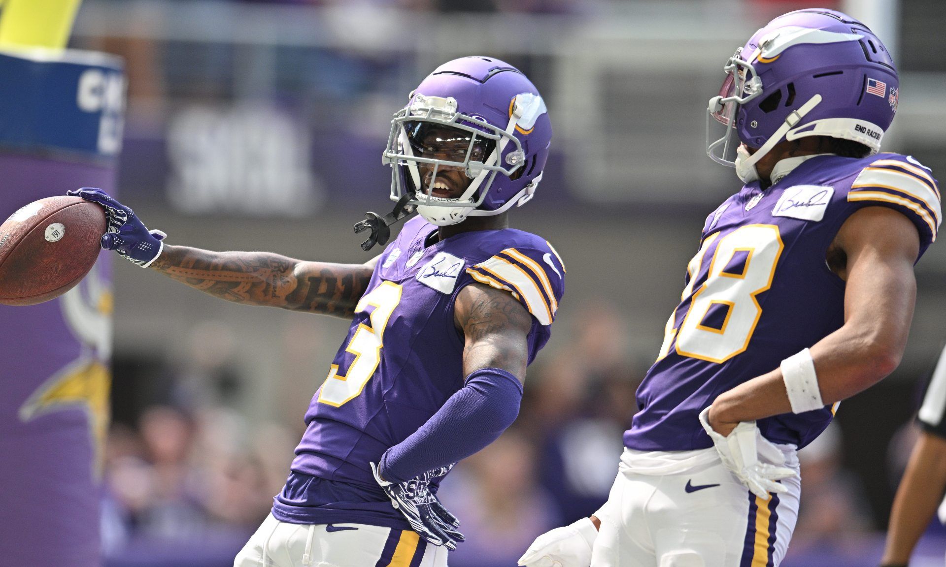 Sep 10, 2023; Minneapolis, Minnesota, USA; Minnesota Vikings wide receiver Jordan Addison (3) reacts with wide receiver Justin Jefferson (18) after scoring his first career touchdown pass from quarterback Kirk Cousins (not pictured) against the Tampa Bay Buccaneers during the second quarter at U.S. Bank Stadium. Mandatory Credit: Jeffrey Becker-USA TODAY Sports