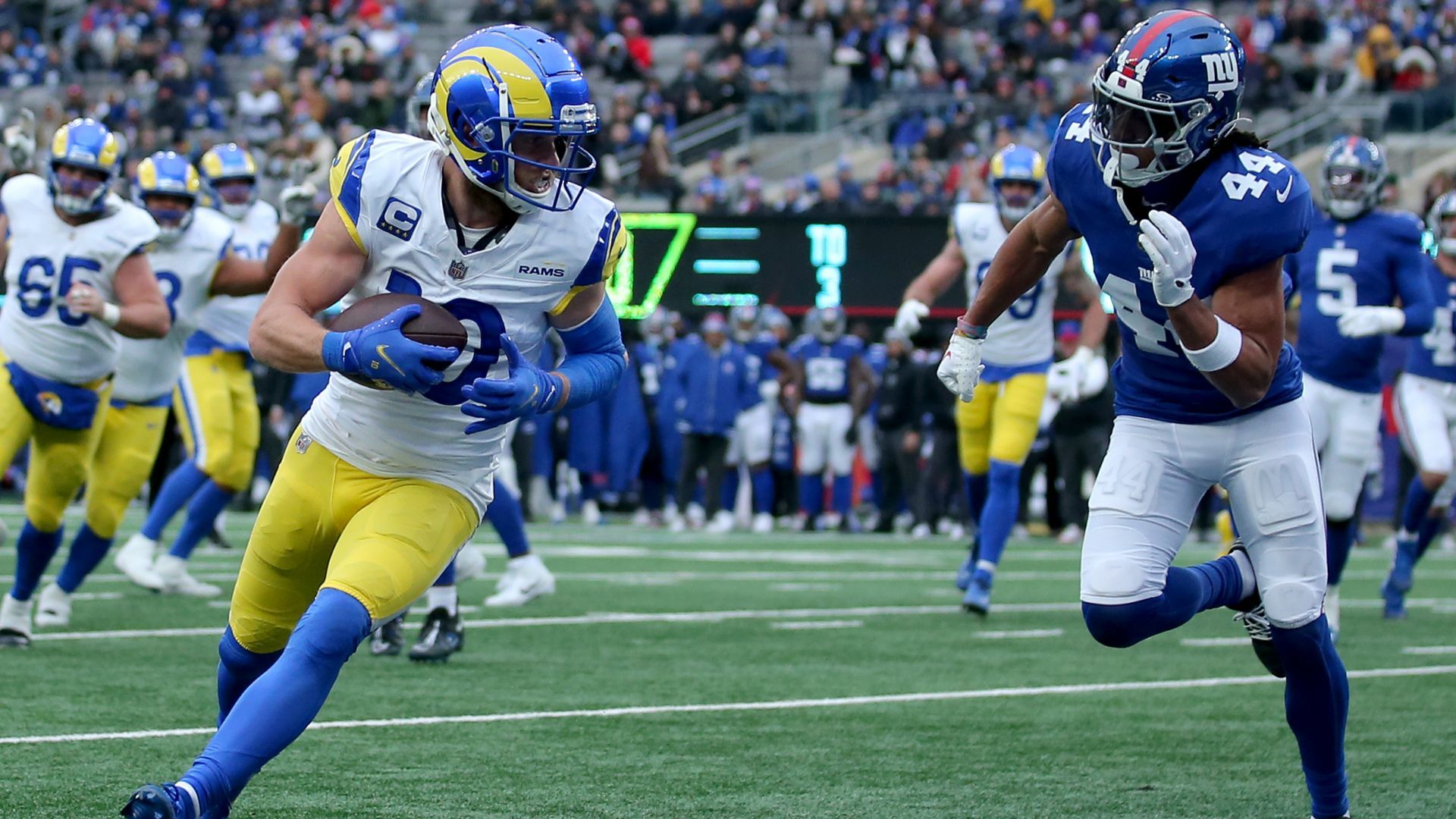 Dec 31, 2023; East Rutherford, New Jersey, USA; Los Angeles Rams wide receiver Cooper Kupp (10) catches a touchdown pass against New York Giants cornerback Nick McCloud (44) during the second quarter at MetLife Stadium. Mandatory Credit: Brad Penner-USA TODAY Sports
