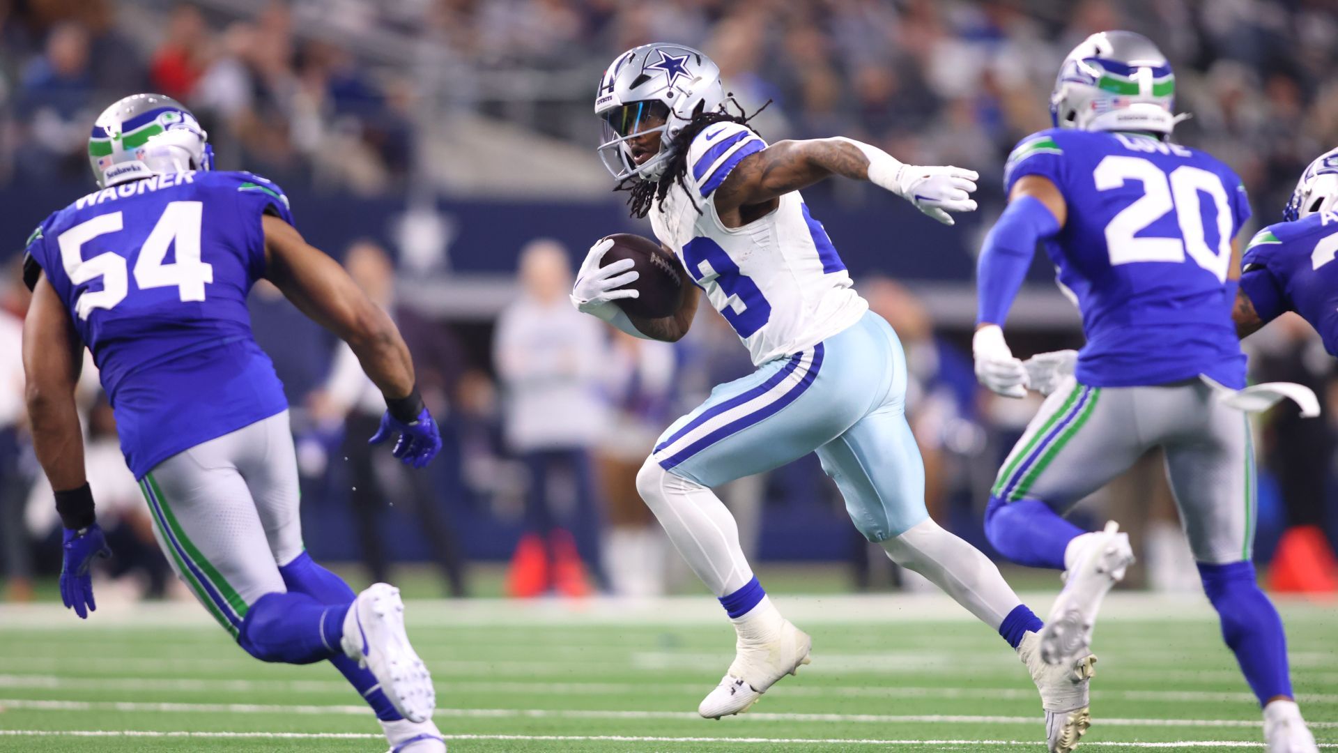 Nov 30, 2023; Arlington, Texas, USA; Dallas Cowboys running back Rico Dowdle (23) runs the ball while defended by Seattle Seahawks linebacker Bobby Wagner (54) and safety Julian Love (20) during the first half at AT&T Stadium. Mandatory Credit: Tim Heitman-USA TODAY Sports