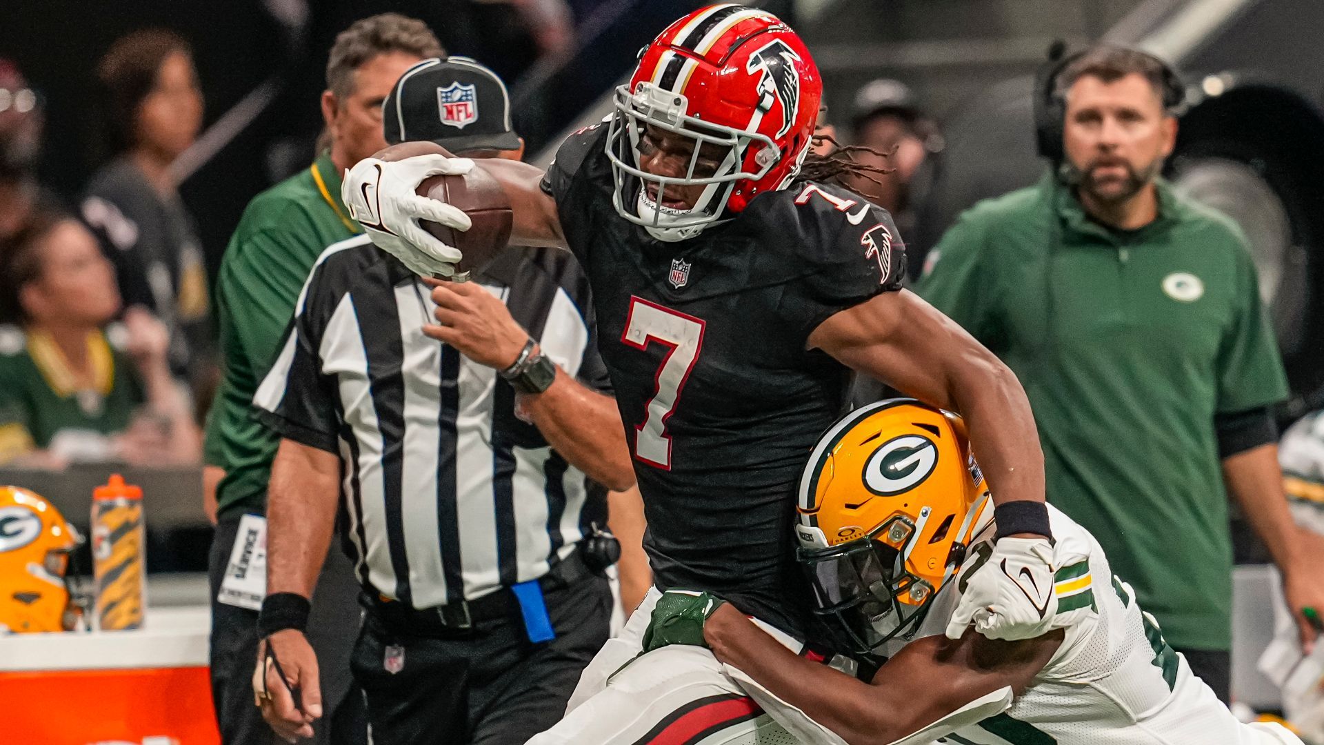 Sep 17, 2023; Atlanta, Georgia, USA; Atlanta Falcons running back Bijan Robinson (7) runs against Green Bay Packers safety Rudy Ford (20) during the second half at Mercedes-Benz Stadium. Mandatory Credit: Dale Zanine-USA TODAY Sports