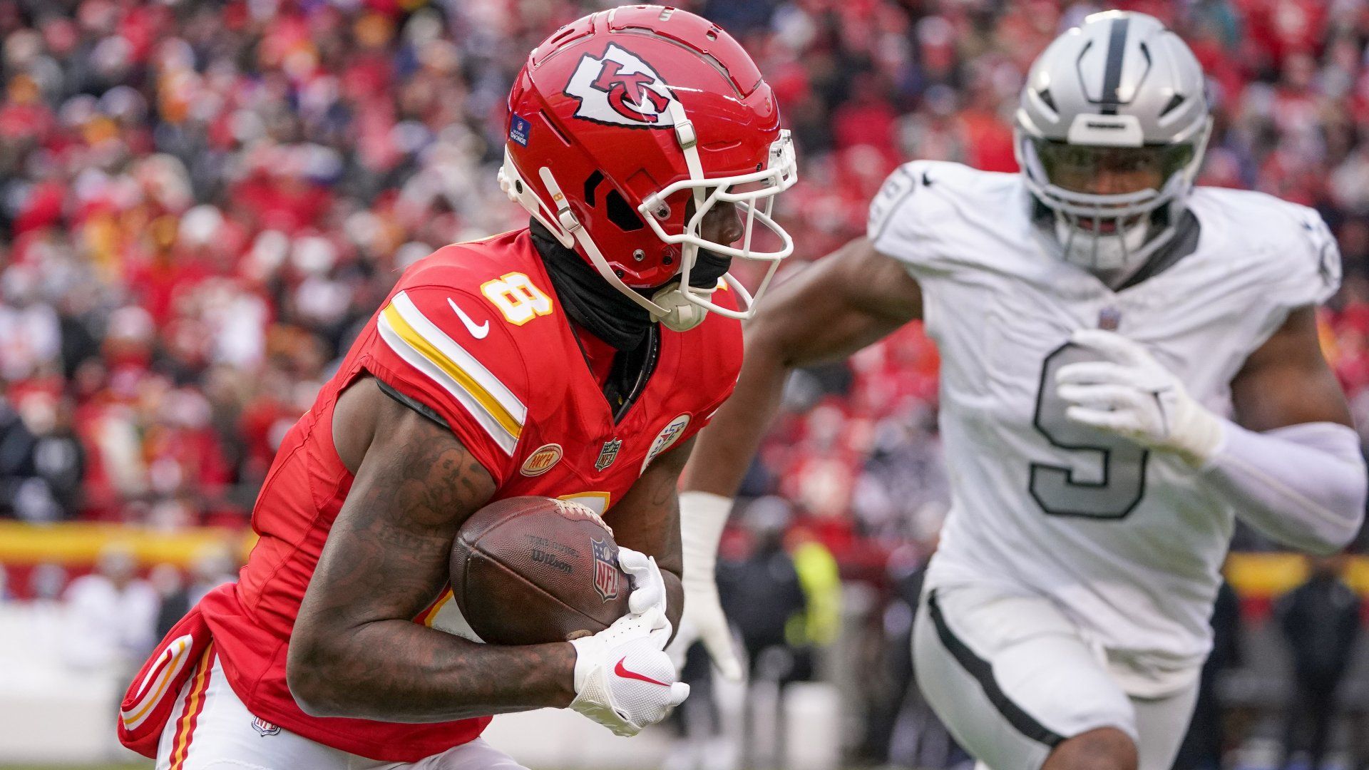 Dec 25, 2023; Kansas City, Missouri, USA; Kansas City Chiefs wide receiver Rashee Rice (4) runs the ball as Las Vegas Raiders defensive end Tyree Wilson (9) chases during the second half at GEHA Field at Arrowhead Stadium. Mandatory Credit: Denny Medley-USA TODAY Sports
