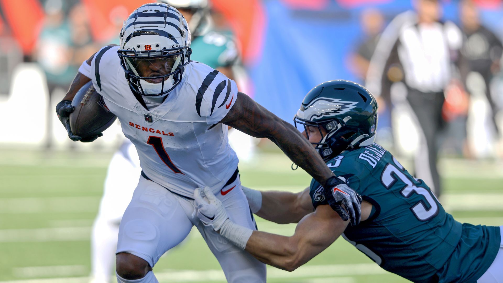 Cincinnati Bengals wide receiver Ja'Marr Chase (1) turns downfield after completing a catch in the fourth quarter of a Week 10 NFL football game between the Houston Texans and the Cincinnati Bengals, Sunday, Nov. 12, 2023, at Paycor Stadium in Cincinnati. The Houston Texans won, 30-27. Credit: Kareem Elgazzar/The Enquirer / USA TODAY NETWORK