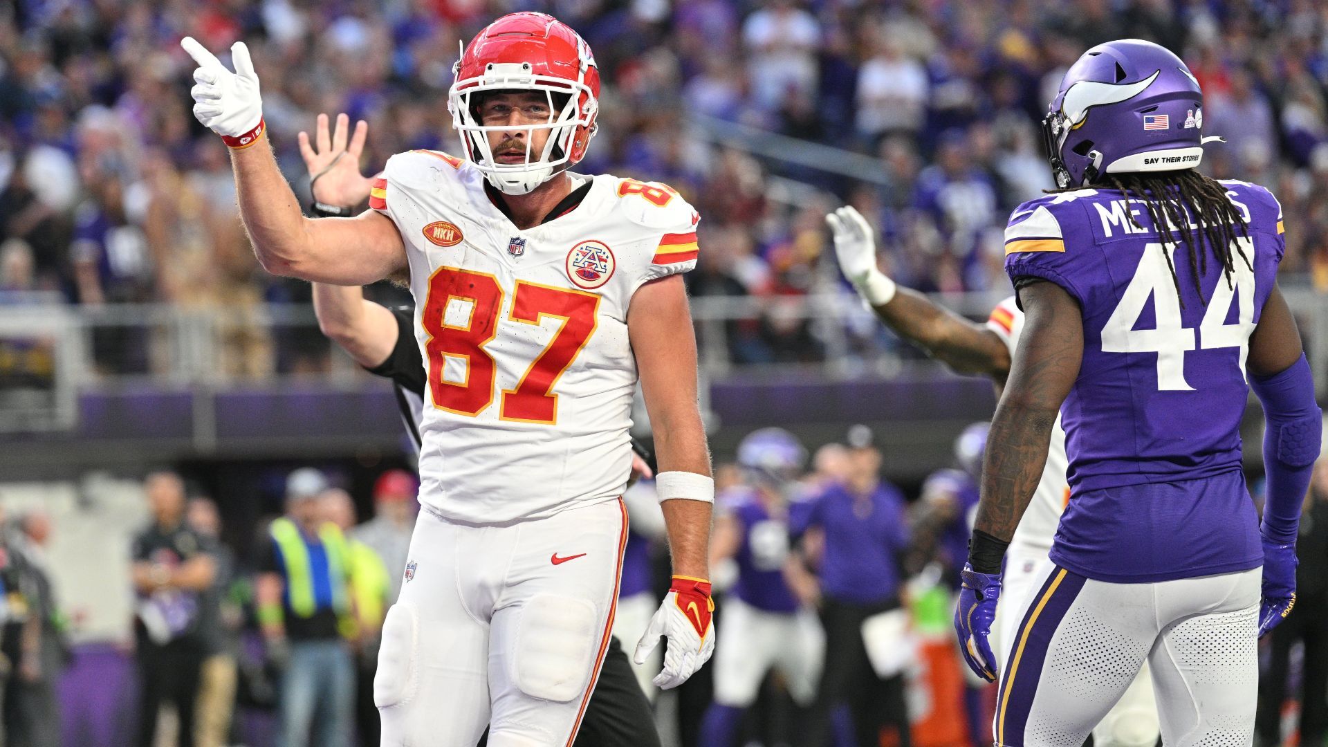 Oct 8, 2023; Minneapolis, Minnesota, USA; Kansas City Chiefs tight end Travis Kelce (87) reacts to a first down as Minnesota Vikings safety Josh Metellus (44) looks on during the third quarter at U.S. Bank Stadium. Mandatory Credit: Jeffrey Becker-USA TODAY Sports
