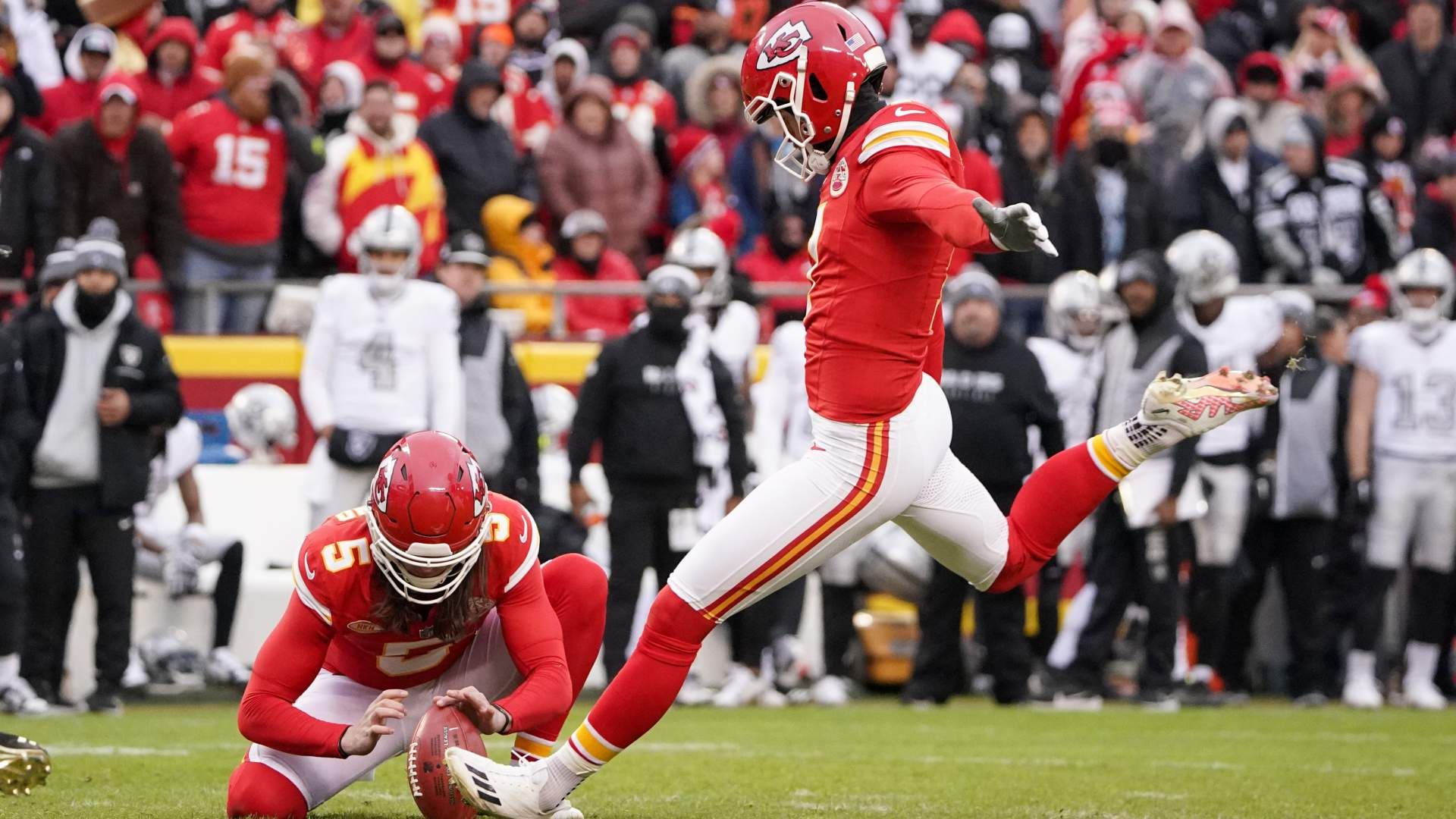 Dec 25, 2023; Kansas City, Missouri, USA; Kansas City Chiefs place kicker Harrison Butker (7) kicks the point after touchdown against the Las Vegas Raiders during the second half at GEHA Field at Arrowhead Stadium. Mandatory Credit: Denny Medley-USA TODAY Sports