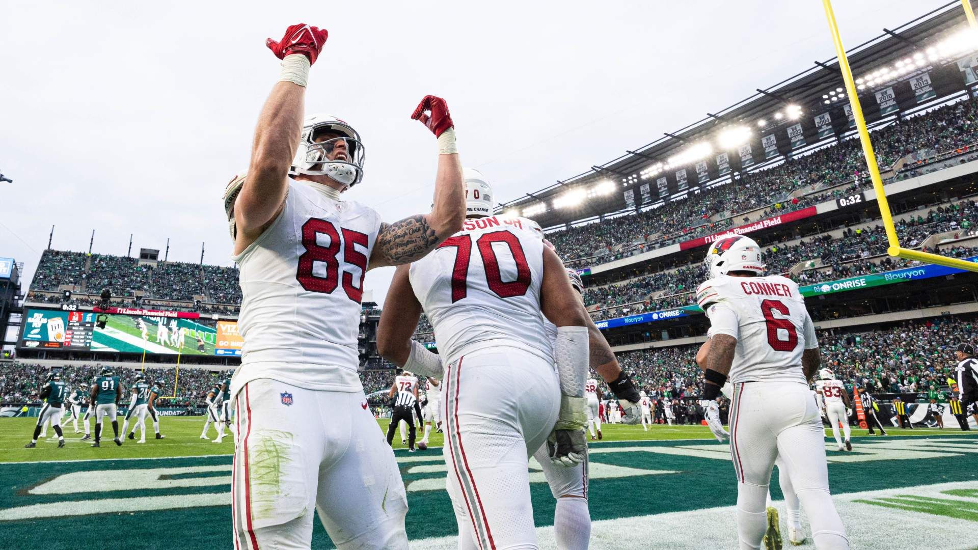 Dec 31, 2023; Philadelphia, Pennsylvania, USA; Arizona Cardinals tight end Trey McBride (85) reacts after running back James Conner (6) runs for a touchdown against the Philadelphia Eagles during the fourth quarter at Lincoln Financial Field. Mandatory Credit: Bill Streicher-USA TODAY Sports