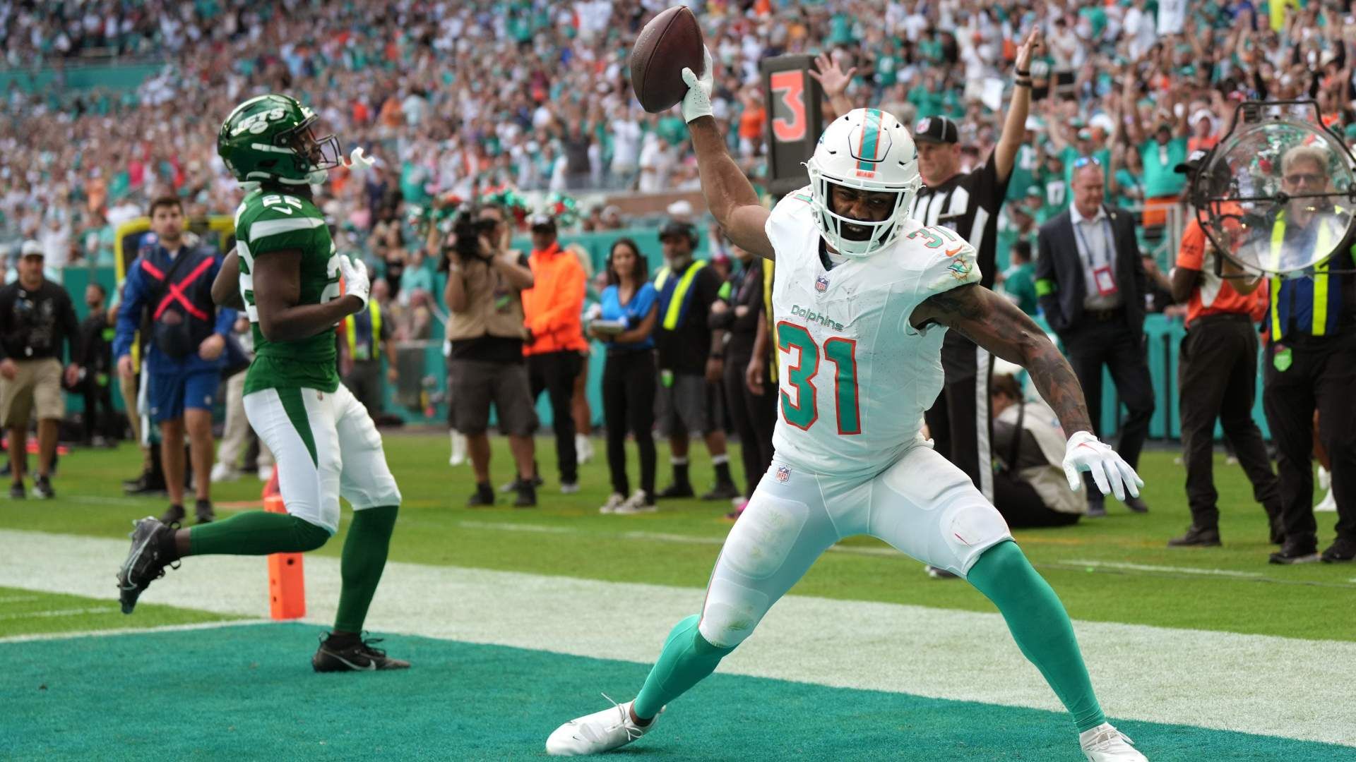 Miami Dolphins running back Raheem Mostert (31) spikes the ball after scoring a touchdown past New York Jets safety Tony Adams (22) during the first half of an NFL game at Hard Rock Stadium in Miami Gardens, Dec. 17, 2023. Photo Credit: Jim Rassol / USA TODAY NETWORK