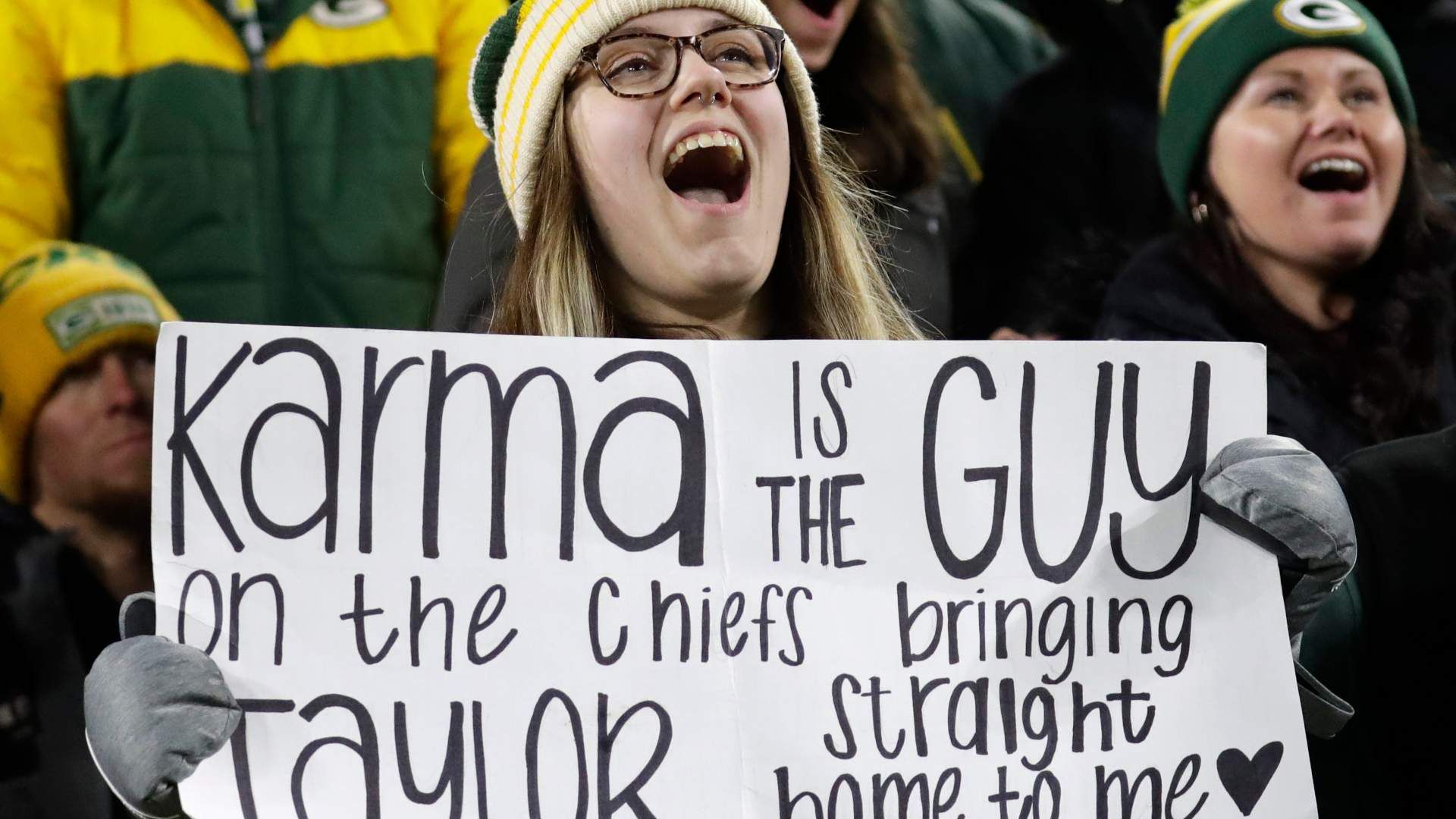 A Taylor Swift fan shows off her sign during their football game Sunday, December 3, 2023, at Lambeau Field in Green Bay, Wis. Photo Credit: Dan Powers/USA TODAY NETWORK-Wisconsin.
