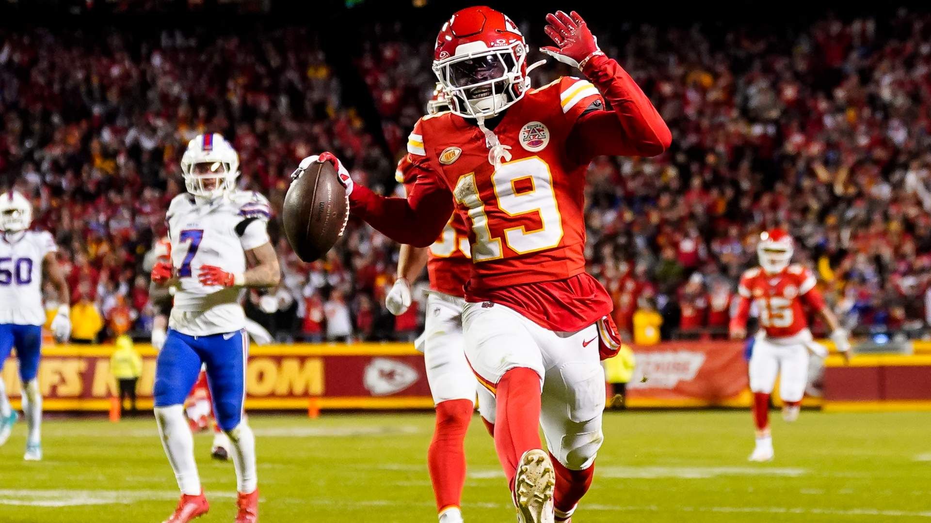 Dec 10, 2023; Kansas City, Missouri, USA; Kansas City Chiefs wide receiver Kadarius Toney (19) scores a touchdown during the second half against the Buffalo Bills at GEHA Field at Arrowhead Stadium. The play would be called back due to an offensive penalty. Mandatory Credit: Jay Biggerstaff-USA TODAY Sports