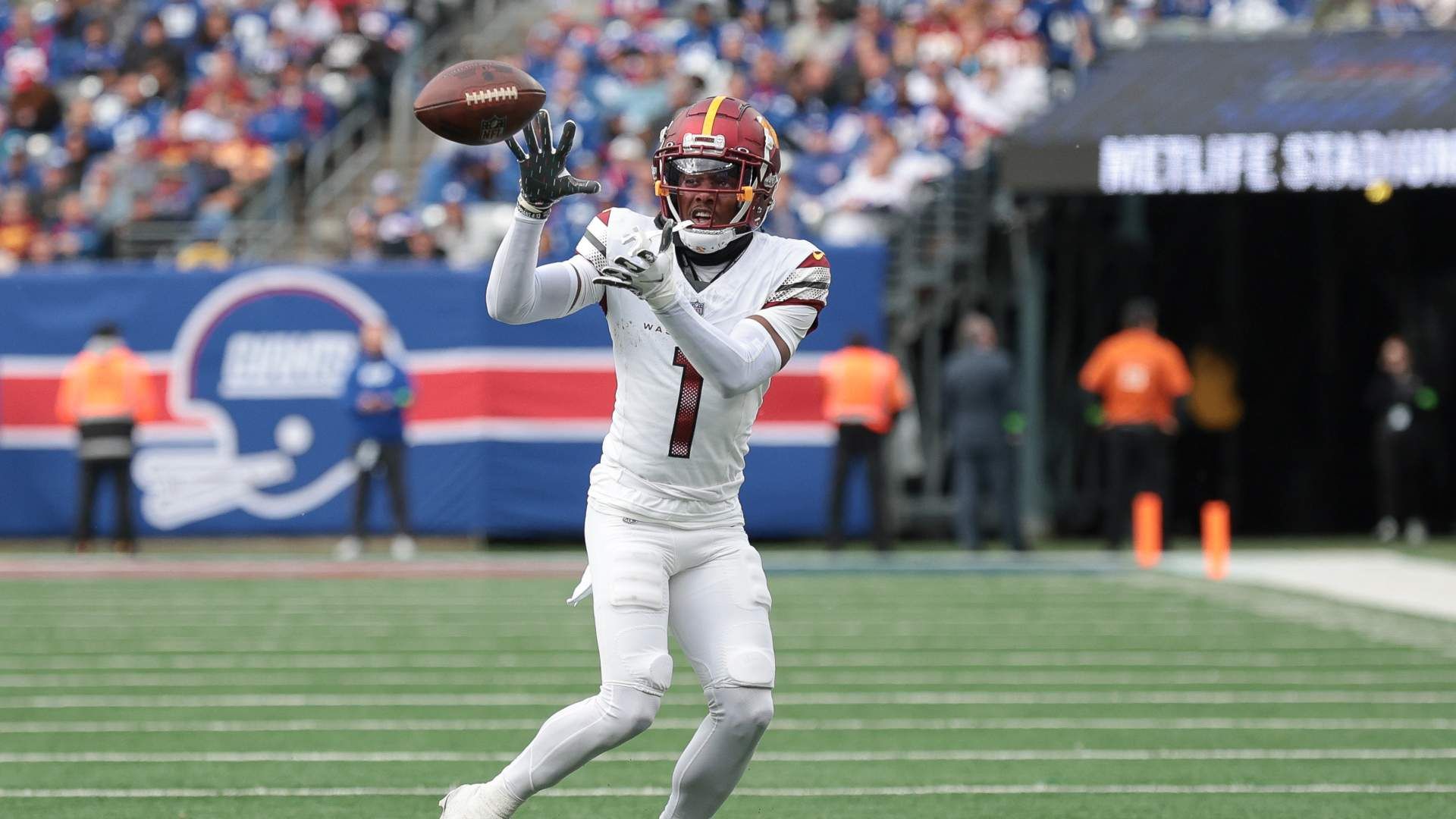Oct 22, 2023; East Rutherford, New Jersey, USA; Washington Commanders wide receiver Jahan Dotson (1) makes a catch during the second half against the New York Giants at MetLife Stadium. Mandatory Credit: Vincent Carchietta-USA TODAY Sports