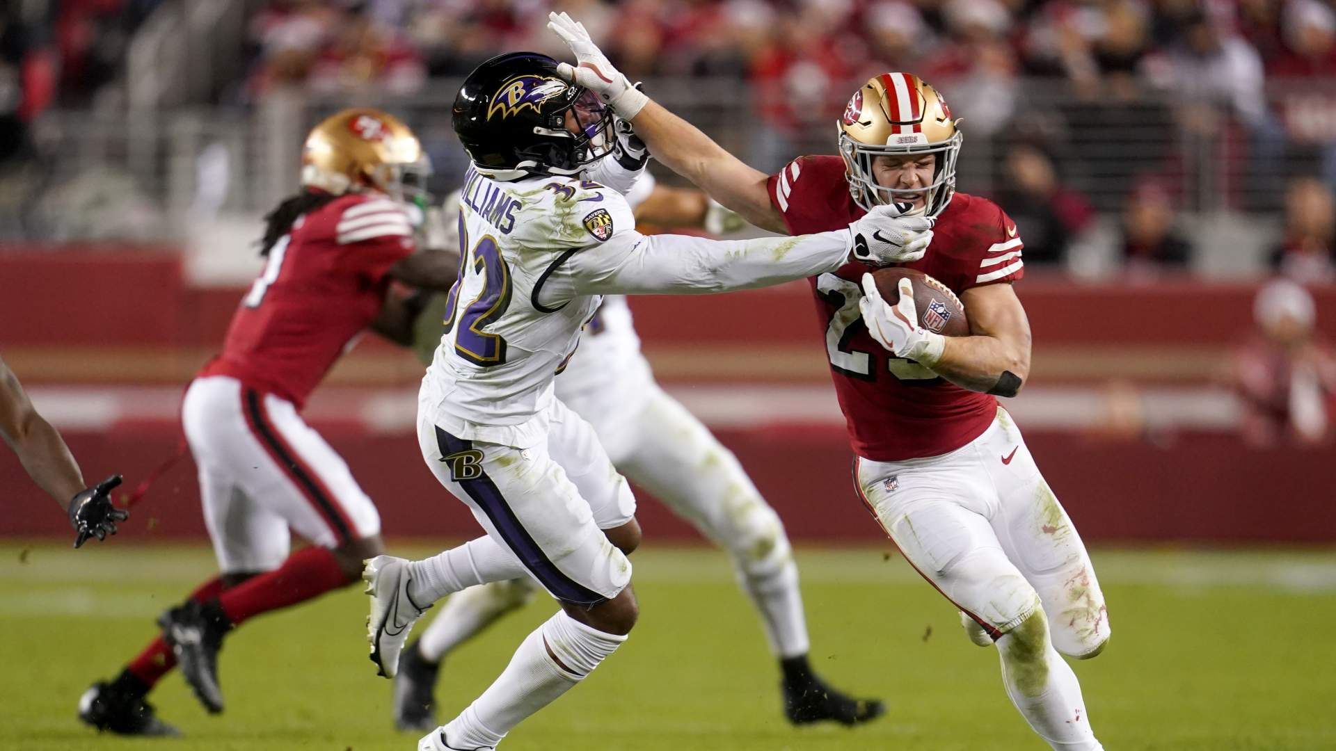 Dec 25, 2023; Santa Clara, California, USA; San Francisco 49ers running back Christian McCaffrey (23) stiff arms Baltimore Ravens safety Marcus Williams (32) in the third quarter at Levi's Stadium. Mandatory Credit: Cary Edmondson-USA TODAY Sports