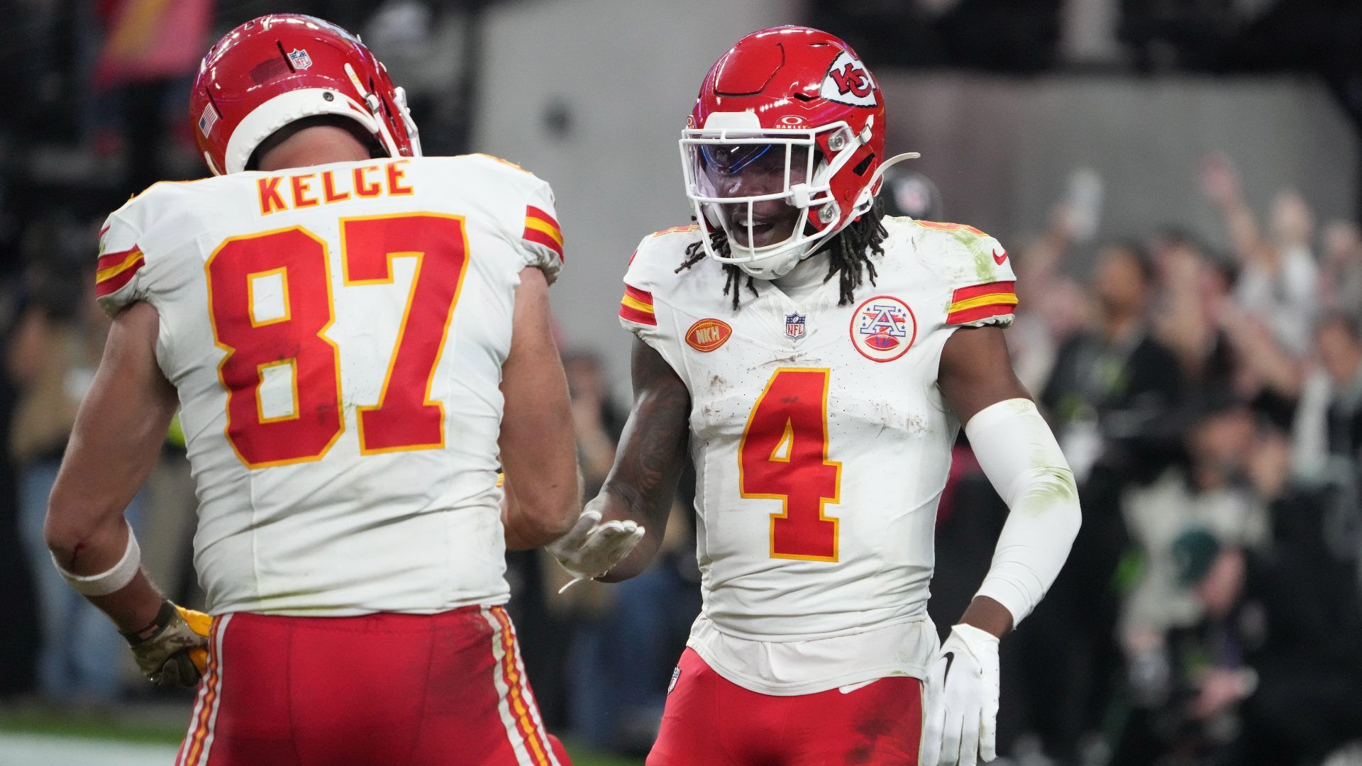 Nov 26, 2023; Paradise, Nevada, USA; Kansas City Chiefs wide receiver Rashee Rice (4) celebrates with tight end Travis Kelce (87) after a touchdown against the Las Vegas Raiders in the second half at Allegiant Stadium. Mandatory Credit: Kirby Lee-USA TODAY Sports
