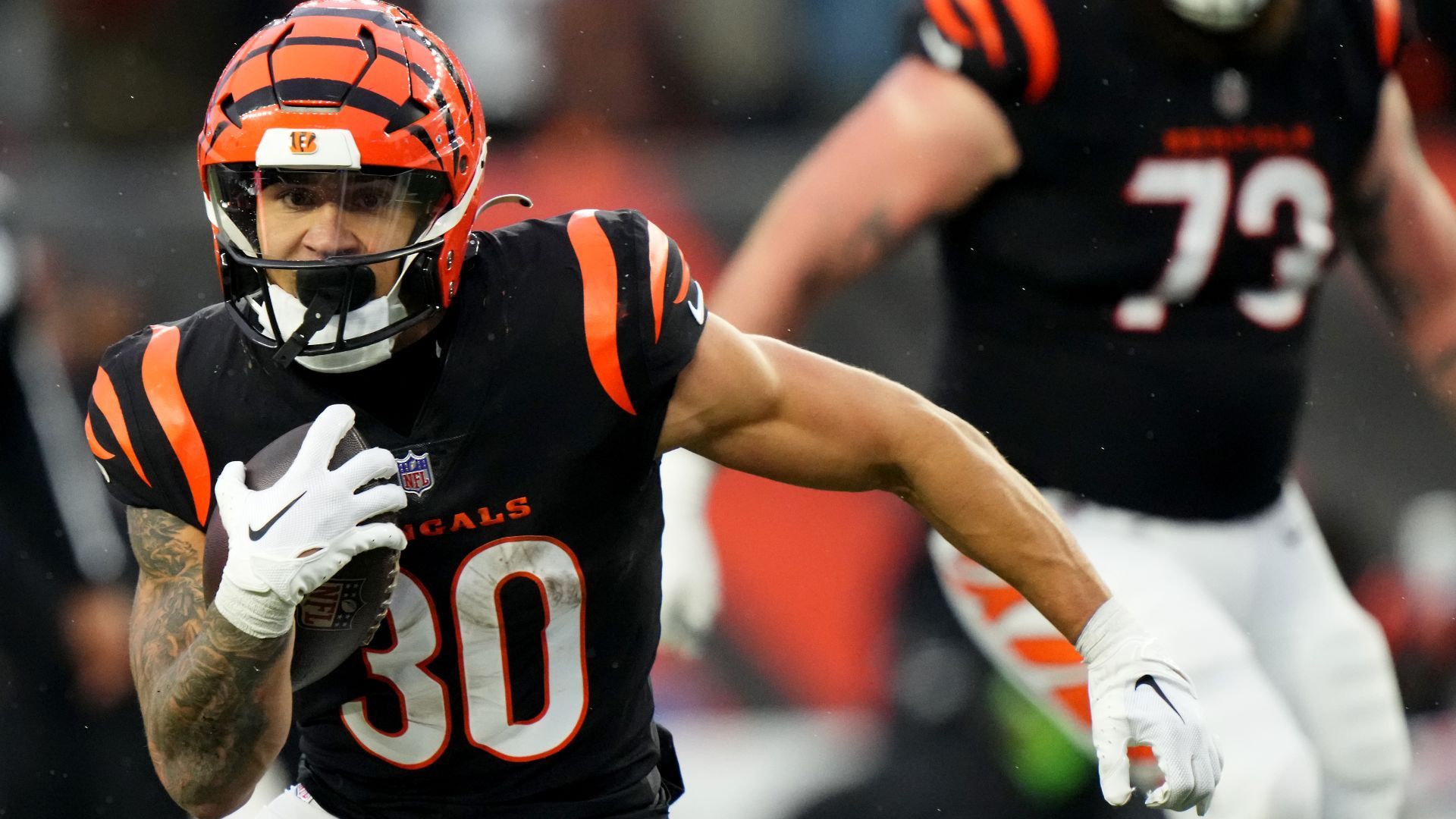 Dec. 10, 2023; Cincinnati, Ohio, USA; Cincinnati Bengals running back Chase Brown (30) carries the ball in the fourth quarter at Paycor Stadium. Mandatory Credit - Kareem Elgazzar/USA TODAY Sports Network via The Cincinnati Enquirer