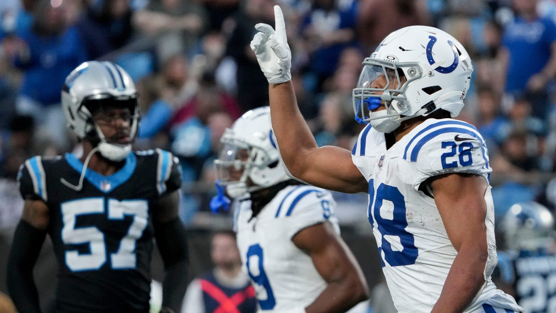 Indianapolis Colts running back Jonathan Taylor (28) celebrates a touchdown Sunday, Nov. 5, 2023, during a game against the Carolina Panthers at Bank of America Stadium in Charlotte. Credit: Jenna Watson/IndyStar / USA TODAY NETWORK