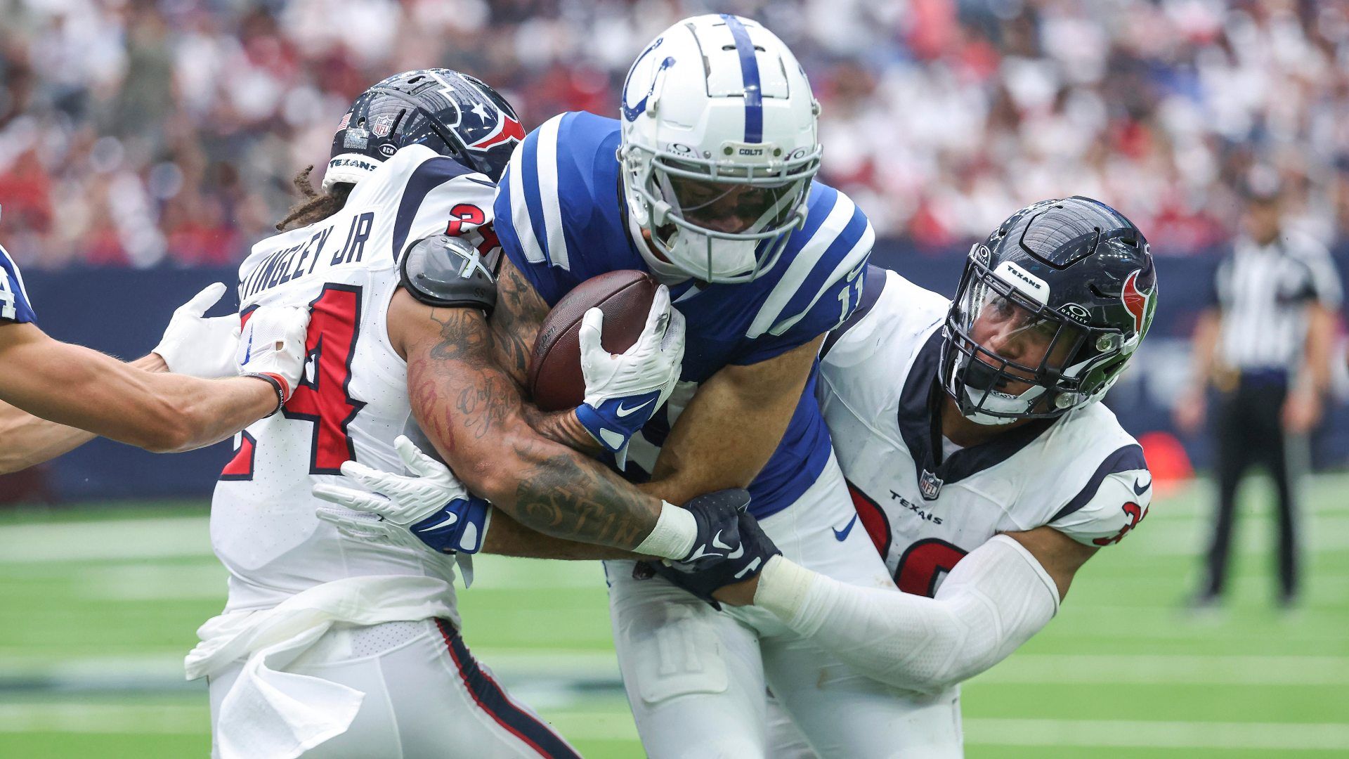 Sep 17, 2023; Houston, Texas, USA; Houston Texans cornerback Derek Stingley Jr. (24) and linebacker Henry To'oTo'o (39) attempt to tackle Indianapolis Colts wide receiver Michael Pittman Jr. (11) during the third quarter at NRG Stadium. Mandatory Credit: Troy Taormina-USA TODAY Sports