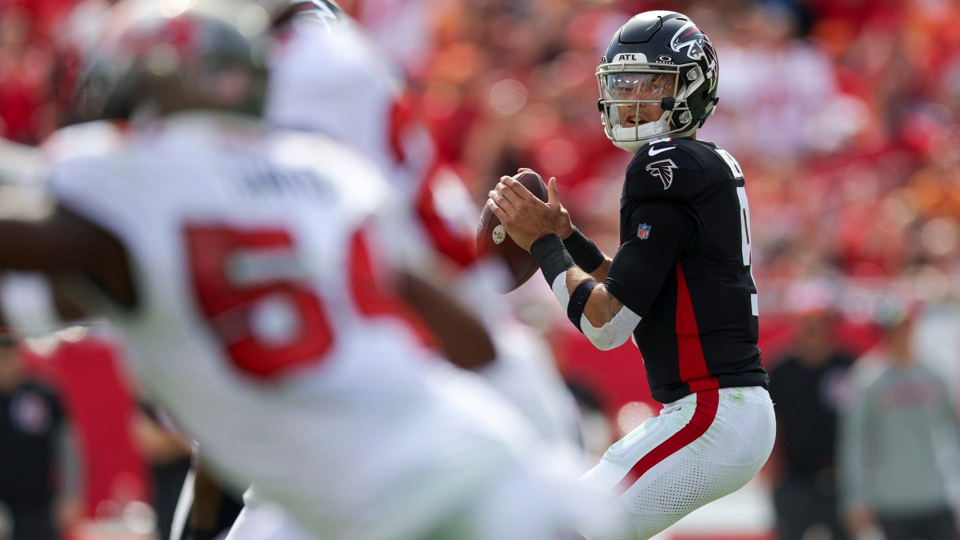 Oct 22, 2023; Tampa, Florida, USA; Atlanta Falcons quarterback Desmond Ridder (9) drops back top pass against the Tampa Bay Buccaneers in the third quarter at Raymond James Stadium. Mandatory Credit: Nathan Ray Seebeck-USA TODAY Sports