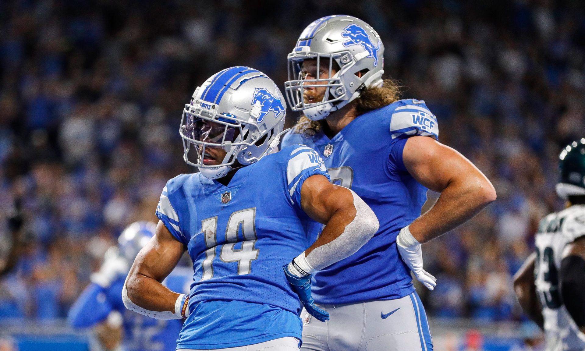 Sep 11, 2022; Detroit, Michigan, USA; Detroit Lions receiver Amon-Ra St. Brown (14) scores and celebrates a touchdown against the Philadelphia Eagles during the second half at Ford Field. Nfl Philadelphia Eagles At Detroit Lions