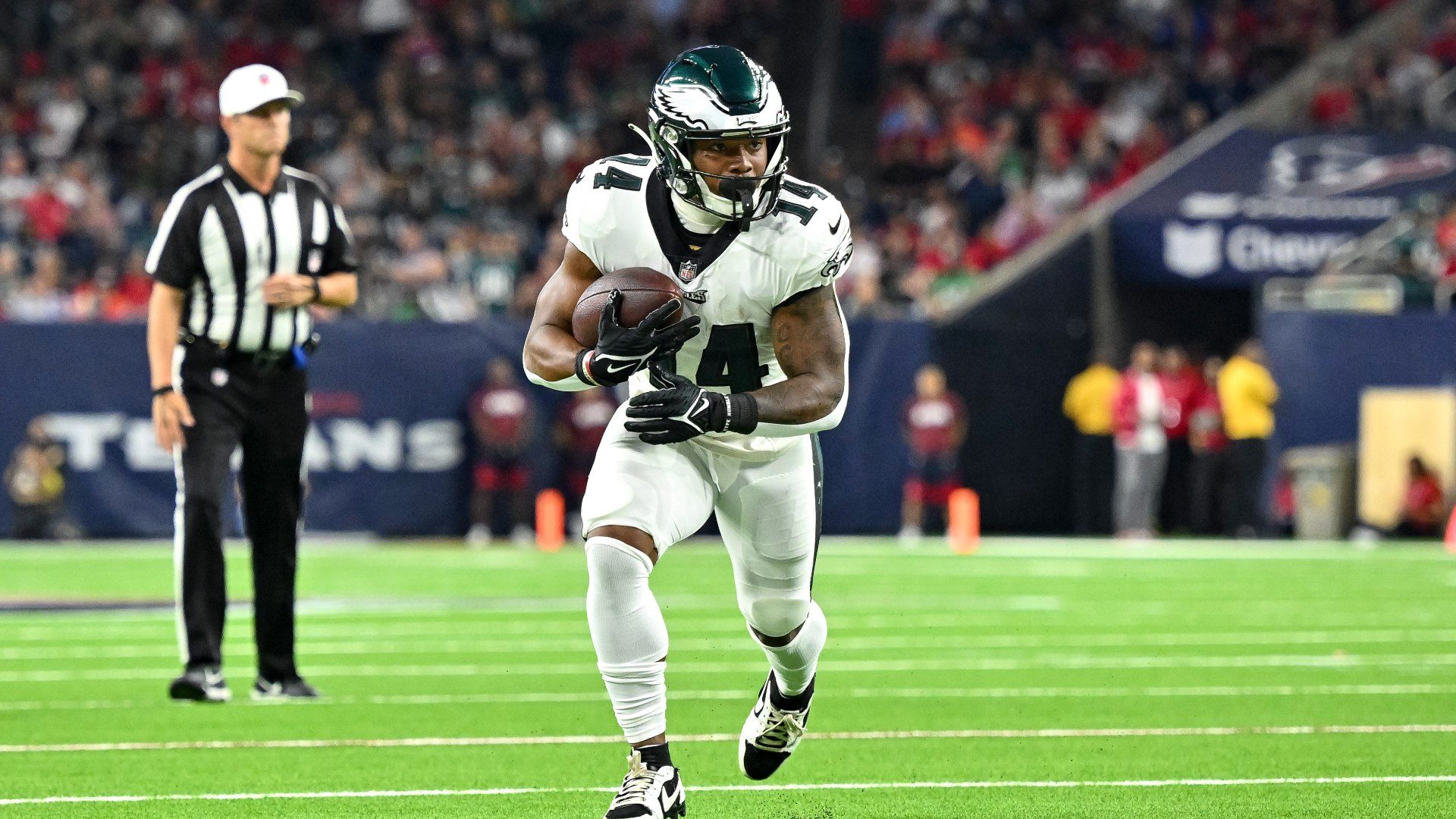 Nov 3, 2022; Houston, Texas, USA; Philadelphia Eagles running back Kenneth Gainwell (14) runs the ball during the first quarter against the Houston Texans at NRG Stadium. Mandatory Credit: Maria Lysaker-USA TODAY Sports