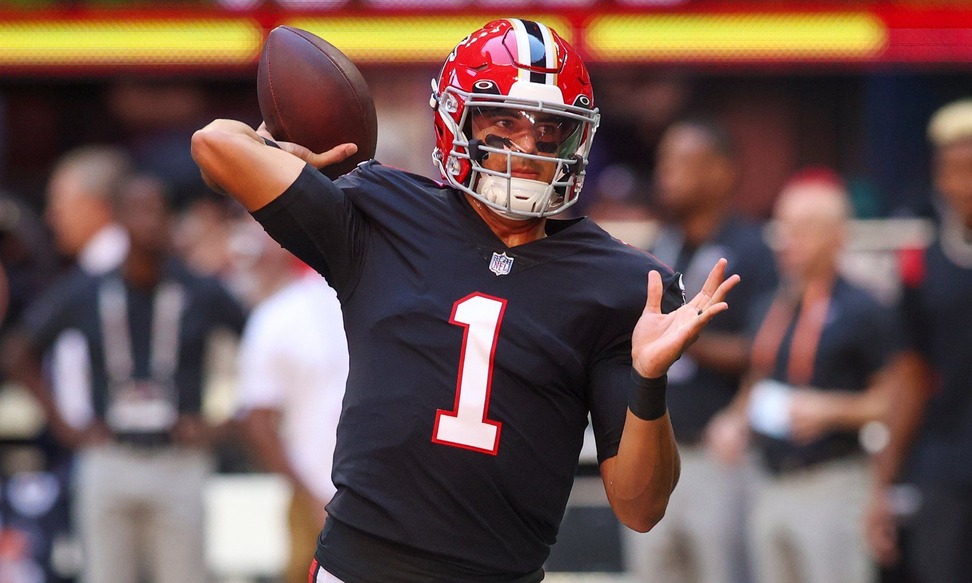 Oct 16, 2022; Atlanta, Georgia, USA; Atlanta Falcons quarterback Marcus Mariota (1) warms up before the game against the San Francisco 49ers at Mercedes-Benz Stadium. Mandatory Credit: Brett Davis-USA TODAY Sports